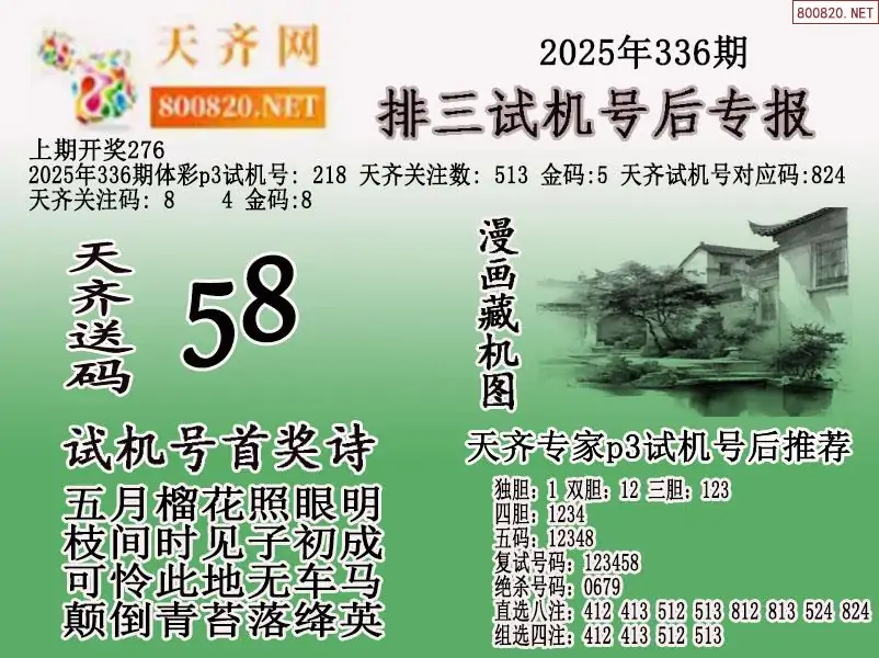 首页〉 P3图谜 走势图 P3预测P3图谜P3字谜P3技巧P3条件P3胆码P3杀码P5预测天齐图库走势图工具试机号 2025年336期体彩p3试机号后天齐网专报 发布时间:2025-12-16 17:17 工具:P3过滤缩水P3试机号走势图 推荐:宝彩APP 免费方案 智能荐号 热点导航 公告: 天齐新版APP<中大多>上线,点击领鲜 最新文章 中大多 排列三第2025336于海滨3D直选 排列三第2025336直选特邀专家 红黄蓝报25336期小黄报小蓝报25336期体彩P3杀码图迷汇总(天齐网整理)25336期体彩P3胆码图迷汇总(天齐网整理)蜂巢图25336期迷宫寻胆+天机玄机P3图谜25336期彩吧p3全图p3九宫图谜25336期天齐P3图谜总汇 更多P3图谜 > 福彩3D 双色球 大乐透 排列三 更多> 3D胆码 3D预测 3D字谜 3D图谜 解太湖 3D条件 3D杀码 P3预测 P3图谜 P3字谜 P3条件 P3胆码 P3杀码 热点导航 天齐图库 走势图 工具图表 试机号 宝彩专家 智能荐号 菜单导航 关闭 福彩3D 3D专家 3D胆码 3D预测 3D字谜 3D图谜 解太湖 3D条件 3D杀码 3D技巧 3D走势图 体彩P3/P5 P3专家 P3预测 P3图谜 P3字谜 P3条件 P3胆码 P3杀码 P5预测 P3走势图 双色球 双色球专家 双色球预测 双色球杀号 双色球字图 双色球胆码 双色球走势 双色球技巧 大乐透 大乐透专家 大乐透预测 大乐透杀号 大乐透胆码 大乐透技巧 大乐透走势 天齐图库 七星彩 七星彩专家 七星彩预测 七星彩图谜 七星彩杀号 七星彩技巧 七星彩走势 天齐走势 七乐彩 七乐彩专家 七乐彩预测 七乐彩杀号 七乐彩技巧 七乐彩走势 热点导航 彩宝网 宝彩网 宝彩网 开奖公告 宝彩专家 牛票票