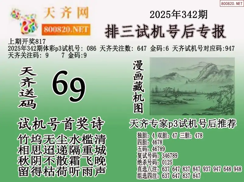 首页〉 P3图谜 走势图 P3预测P3图谜P3字谜P3技巧P3条件P3胆码P3杀码P5预测天齐图库走势图工具试机号 2025年342期体彩p3试机号后天齐网专报 发布时间:2025-12-22 17:28 工具:P3过滤缩水P3试机号走势图 推荐:宝彩APP 免费方案 智能荐号 热点导航 公告: 天齐新版APP<中大多>上线,点击领鲜 最新文章 中大多 排列三第2025342三毛综合分析已公开 排列三第2025342于海滨3D直选 红黄蓝报25342期小黄报小蓝报蜂巢图25342期迷宫寻胆+天机玄机P3图谜25342期体彩P3杀码图迷汇总(天齐网整理)25342期体彩P3胆码图迷汇总(天齐网整理)25342期天齐P3图谜总汇2025342期p3北盟天机图+p3仙机图谜 更多P3图谜 > 福彩3D 双色球 大乐透 排列三 更多> 3D胆码 3D预测 3D字谜 3D图谜 解太湖 3D条件 3D杀码 P3预测 P3图谜 P3字谜 P3条件 P3胆码 P3杀码 热点导航 天齐图库 走势图 工具图表 试机号 宝彩专家 智能荐号 菜单导航 关闭 福彩3D 3D专家 3D胆码 3D预测 3D字谜 3D图谜 解太湖 3D条件 3D杀码 3D技巧 3D走势图 体彩P3/P5 P3专家 P3预测 P3图谜 P3字谜 P3条件 P3胆码 P3杀码 P5预测 P3走势图 双色球 双色球专家 双色球预测 双色球杀号 双色球字图 双色球胆码 双色球走势 双色球技巧 大乐透 大乐透专家 大乐透预测 大乐透杀号 大乐透胆码 大乐透技巧 大乐透走势 天齐图库 七星彩 七星彩专家 七星彩预测 七星彩图谜 七星彩杀号 七星彩技巧 七星彩走势 天齐走势 七乐彩 七乐彩专家 七乐彩预测 七乐彩杀号 七乐彩技巧 七乐彩走势 热点导航 彩宝网 宝彩网 宝彩网 开奖公告 宝彩专家 牛票票