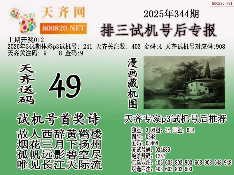 首页〉 P3图谜 走势图 P3预测P3图谜P3字谜P3技巧P3条件P3胆码P3杀码P5预测天齐图库走势图工具试机号 2025年344期体彩p3试机号后天齐网专报 发布时间:2025-12-24 18:04 工具:P3过滤缩水P3试机号走势图 推荐:宝彩APP 免费方案 智能荐号 热点导航 公告: 天齐新版APP<中大多>上线,点击领鲜 最新文章 中大多 排列三第2025344于海滨3D直选 排列三第2025344于海滨3D胆码预测 2025年344期体彩p3试机号后天齐网专报红黄蓝报25344期小黄报小蓝报25344期体彩P3杀码图迷汇总(天齐网整理)25344期体彩P3胆码图迷汇总(天齐网整理)蜂巢图25344期迷宫寻胆+天机玄机P3图谜25344期彩吧p3全图p3九宫图谜 更多P3图谜 > 福彩3D 双色球 大乐透 排列三 更多> 3D胆码 3D预测 3D字谜 3D图谜 解太湖 3D条件 3D杀码 P3预测 P3图谜 P3字谜 P3条件 P3胆码 P3杀码 热点导航 天齐图库 走势图 工具图表 试机号 宝彩专家 智能荐号 菜单导航 关闭 福彩3D 3D专家 3D胆码 3D预测 3D字谜 3D图谜 解太湖 3D条件 3D杀码 3D技巧 3D走势图 体彩P3/P5 P3专家 P3预测 P3图谜 P3字谜 P3条件 P3胆码 P3杀码 P5预测 P3走势图 双色球 双色球专家 双色球预测 双色球杀号 双色球字图 双色球胆码 双色球走势 双色球技巧 大乐透 大乐透专家 大乐透预测 大乐透杀号 大乐透胆码 大乐透技巧 大乐透走势 天齐图库 七星彩 七星彩专家 七星彩预测 七星彩图谜 七星彩杀号 七星彩技巧 七星彩走势 天齐走势 七乐彩 七乐彩专家 七乐彩预测 七乐彩杀号 七乐彩技巧 七乐彩走势 热点导航 彩宝网 宝彩网 宝彩网 开奖公告 宝彩专家 牛票票