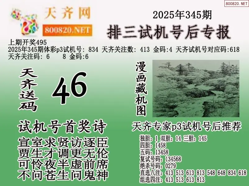 首页〉 P3图谜 走势图 P3预测P3图谜P3字谜P3技巧P3条件P3胆码P3杀码P5预测天齐图库走势图工具试机号 2025年345期体彩p3试机号后天齐网专报 发布时间:2025-12-25 17:39 工具:P3过滤缩水P3试机号走势图 推荐:宝彩APP 免费方案 智能荐号 热点导航 公告: 天齐新版APP<中大多>上线,点击领鲜 最新文章 中大多 排列三第2025345徐文轩预测本期3D直选 排列三第2025345于海滨3D五码复试 红黄蓝报25345期小黄报小蓝报蜂巢图25345期迷宫寻胆+天机玄机P3图谜25345期体彩P3杀码图迷汇总(天齐网整理)25345期体彩P3胆码图迷汇总(天齐网整理)25345期彩吧p3全图p3九宫图谜25345期天齐P3图谜总汇 更多P3图谜 > 福彩3D 双色球 大乐透 排列三 更多> 3D胆码 3D预测 3D字谜 3D图谜 解太湖 3D条件 3D杀码 P3预测 P3图谜 P3字谜 P3条件 P3胆码 P3杀码 热点导航 天齐图库 走势图 工具图表 试机号 宝彩专家 智能荐号 菜单导航 关闭 福彩3D 3D专家 3D胆码 3D预测 3D字谜 3D图谜 解太湖 3D条件 3D杀码 3D技巧 3D走势图 体彩P3/P5 P3专家 P3预测 P3图谜 P3字谜 P3条件 P3胆码 P3杀码 P5预测 P3走势图 双色球 双色球专家 双色球预测 双色球杀号 双色球字图 双色球胆码 双色球走势 双色球技巧 大乐透 大乐透专家 大乐透预测 大乐透杀号 大乐透胆码 大乐透技巧 大乐透走势 天齐图库 七星彩 七星彩专家 七星彩预测 七星彩图谜 七星彩杀号 七星彩技巧 七星彩走势 天齐走势 七乐彩 七乐彩专家 七乐彩预测 七乐彩杀号 七乐彩技巧 七乐彩走势 热点导航 彩宝网 宝彩网 宝彩网 开奖公告 宝彩专家 牛票票