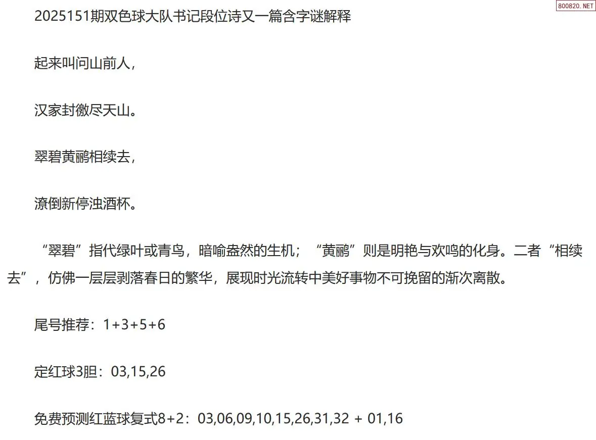 首页〉 双色球字图 走势图 双色球预测双色球杀号双色球技巧双色球字图双色球条件双色球胆码天齐图库走势图工具试机号 双色球第25151期大队书记最新段位诗谜又一篇 专题:大队书记 发布时间:2025-12-28 21:06 工具:双色球胆拖组号双色球缩水过滤 推荐:宝彩APP 免费方案 智能荐号 热点导航 公告: 天齐新版APP<中大多>上线,点击领鲜 最新文章 中大多 双色球第2025151唐龙3D独胆8中7 双色球第20251513D全部料3注已更新 藏机图2025151期天齐原创双色球藏机图迷2025151期天齐网今晚双色球字谜总汇双色球25151期图迷画迷汇总(天齐整理)双色球25年151期天吉龙头凤尾鸟语断蓝图25年151期大胜寨双色球中奖真言双色球25151期牛彩字谜诗迷汇总(天齐整理) 更多双色球字图 > 福彩3D 双色球 大乐透 排列三 更多> 3D胆码 3D预测 3D字谜 3D图谜 解太湖 3D条件 3D杀码 P3预测 P3图谜 P3字谜 P3条件 P3胆码 P3杀码 热点导航 天齐图库 走势图 工具图表 试机号 宝彩专家 智能荐号 菜单导航 关闭 福彩3D 3D专家 3D胆码 3D预测 3D字谜 3D图谜 解太湖 3D条件 3D杀码 3D技巧 3D走势图 体彩P3/P5 P3专家 P3预测 P3图谜 P3字谜 P3条件 P3胆码 P3杀码 P5预测 P3走势图 双色球 双色球专家 双色球预测 双色球杀号 双色球字图 双色球胆码 双色球走势 双色球技巧 大乐透 大乐透专家 大乐透预测 大乐透杀号 大乐透胆码 大乐透技巧 大乐透走势 天齐图库 七星彩 七星彩专家 七星彩预测 七星彩图谜 七星彩杀号 七星彩技巧 七星彩走势 天齐走势 七乐彩 七乐彩专家 七乐彩预测 七乐彩杀号 七乐彩技巧 七乐彩走势 热点导航 彩宝网 宝彩网 宝彩网 开奖公告 宝彩专家 牛票票