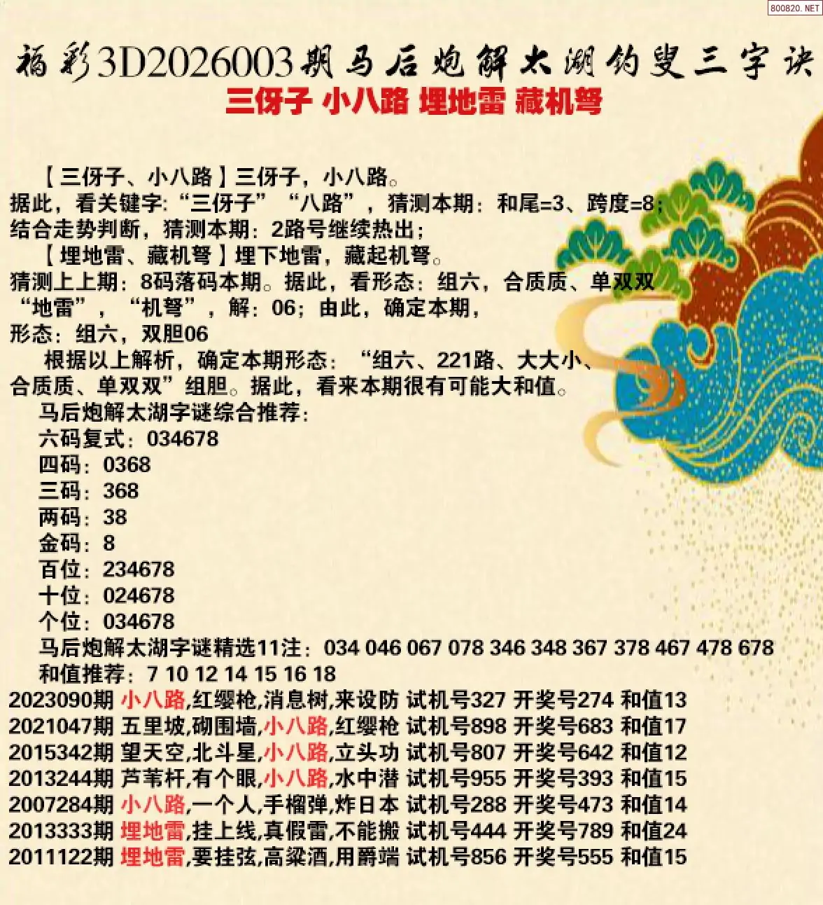 首页〉 解太湖 走势图 3D胆码3D预测3D图谜3D字谜解太湖3D技巧3D条件3D杀码天齐图库走势图工具试机号 26年003期马后炮解太湖字谜之-三伢子 小八路 埋地雷 藏机弩 专题:马后炮解太湖谜 发布时间:2026-01-02 20:29 开奖:3D开奖结果3D近10期试机号 推荐:宝彩APP 免费方案 智能荐号 热点导航 公告: 天齐新版APP<中大多>上线,点击领鲜 最新文章 中大多 3D第20260033D六鬼5码复试5中4 3D第2026003徐文轩预测本期3D直选 26003期3D丹东解太湖 天龙一语 布衣神算26年003期白鱼舟太湖钓叟三字诀解谜天涯草解太湖26年003期太湖 小八路26年002期洞庭游侠破解太湖之谜 筷子拌曹州客解析26年002期太湖之 三鲜馅26年002期热血男儿解太湖3d谜语 筷子拌 更多解太湖 > 福彩3D 双色球 大乐透 排列三 更多> 3D胆码 3D预测 3D字谜 3D图谜 解太湖 3D条件 3D杀码 P3预测 P3图谜 P3字谜 P3条件 P3胆码 P3杀码 热点导航 天齐图库 走势图 工具图表 试机号 宝彩专家 智能荐号 菜单导航 关闭 福彩3D 3D专家 3D胆码 3D预测 3D字谜 3D图谜 解太湖 3D条件 3D杀码 3D技巧 3D走势图 体彩P3/P5 P3专家 P3预测 P3图谜 P3字谜 P3条件 P3胆码 P3杀码 P5预测 P3走势图 双色球 双色球专家 双色球预测 双色球杀号 双色球字图 双色球胆码 双色球走势 双色球技巧 大乐透 大乐透专家 大乐透预测 大乐透杀号 大乐透胆码 大乐透技巧 大乐透走势 天齐图库 七星彩 七星彩专家 七星彩预测 七星彩图谜 七星彩杀号 七星彩技巧 七星彩走势 天齐走势 七乐彩 七乐彩专家 七乐彩预测 七乐彩杀号 七乐彩技巧 七乐彩走势 热点导航 彩宝网 宝彩网 宝彩网 开奖公告 宝彩专家 牛票票