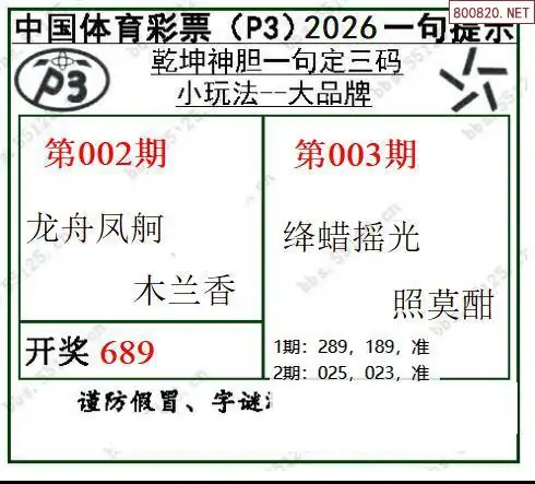 首页〉 P3图谜 走势图 P3预测P3图谜P3字谜P3技巧P3条件P3胆码P3杀码P5预测天齐图库走势图工具试机号 2026003期乾坤一句p3定三码图谜 专题:乾坤一句p3 发布时间:2026-01-02 22:05 工具:P3过滤缩水P3试机号走势图 推荐:宝彩APP 免费方案 智能荐号 热点导航 公告: 天齐新版APP<中大多>上线,点击领鲜 最新文章 中大多 排列三第2026003一码毒蓝连中8期 排列三第2026003徐文轩3D直选 26003期彩吧p3全图p3九宫图谜26003期天齐P3图谜总汇2026003期p3北盟天机图+p3仙机图谜26003期丹东p3图汇总分析金胆图谜26003期体彩P3小熊猫图迷26003期天吉体彩P3玄机怪字图迷 更多P3图谜 > 福彩3D 双色球 大乐透 排列三 更多> 3D胆码 3D预测 3D字谜 3D图谜 解太湖 3D条件 3D杀码 P3预测 P3图谜 P3字谜 P3条件 P3胆码 P3杀码 热点导航 天齐图库 走势图 工具图表 试机号 宝彩专家 智能荐号 菜单导航 关闭 福彩3D 3D专家 3D胆码 3D预测 3D字谜 3D图谜 解太湖 3D条件 3D杀码 3D技巧 3D走势图 体彩P3/P5 P3专家 P3预测 P3图谜 P3字谜 P3条件 P3胆码 P3杀码 P5预测 P3走势图 双色球 双色球专家 双色球预测 双色球杀号 双色球字图 双色球胆码 双色球走势 双色球技巧 大乐透 大乐透专家 大乐透预测 大乐透杀号 大乐透胆码 大乐透技巧 大乐透走势 天齐图库 七星彩 七星彩专家 七星彩预测 七星彩图谜 七星彩杀号 七星彩技巧 七星彩走势 天齐走势 七乐彩 七乐彩专家 七乐彩预测 七乐彩杀号 七乐彩技巧 七乐彩走势 热点导航 彩宝网 宝彩网 宝彩网 开奖公告 宝彩专家 牛票票