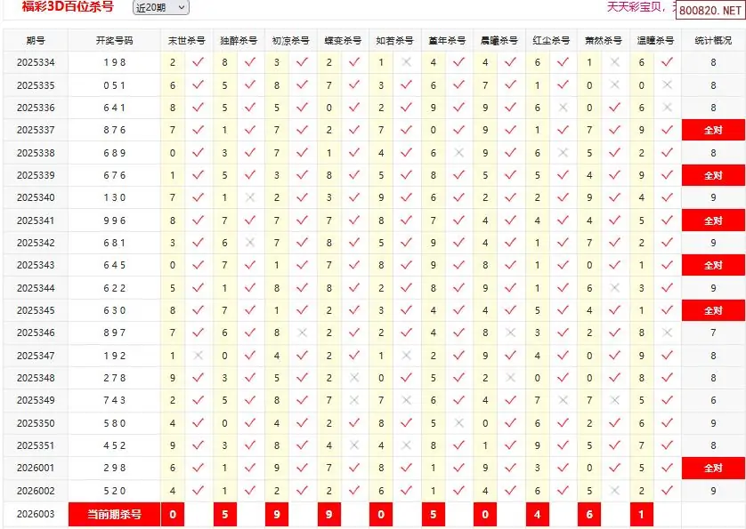 首页〉 3D杀码 走势图 3D胆码3D预测3D图谜3D字谜解太湖3D技巧3D条件3D杀码天齐图库走势图工具试机号 26003期彩宝贝福彩3D百十个位杀号 专题:3D杀码十专家 发布时间:2026-01-03 06:19 开奖:3D开奖结果3D近10期试机号 推荐:宝彩APP 免费方案 智能荐号 热点导航 公告: 天齐新版APP<中大多>上线,点击领鲜 最新文章 中大多 3D第2026003钱王预测金胆 3D第2026003独胆连中免费试料 26年003期[浮梦一生]3d杀一胆 2错126年003期[醉相思]3d杀一码 2错026年003期[忆往昔]3d本期杀号 2错026年003期[顾棋]本期3d杀号 2错126年003期[孤影梵然]杀双胆 2错126年003期[流星风雨]3d杀一码 2错1 更多3D杀码 > 福彩3D 双色球 大乐透 排列三 更多> 3D胆码 3D预测 3D字谜 3D图谜 解太湖 3D条件 3D杀码 P3预测 P3图谜 P3字谜 P3条件 P3胆码 P3杀码 热点导航 天齐图库 走势图 工具图表 试机号 宝彩专家 智能荐号 菜单导航 关闭 福彩3D 3D专家 3D胆码 3D预测 3D字谜 3D图谜 解太湖 3D条件 3D杀码 3D技巧 3D走势图 体彩P3/P5 P3专家 P3预测 P3图谜 P3字谜 P3条件 P3胆码 P3杀码 P5预测 P3走势图 双色球 双色球专家 双色球预测 双色球杀号 双色球字图 双色球胆码 双色球走势 双色球技巧 大乐透 大乐透专家 大乐透预测 大乐透杀号 大乐透胆码 大乐透技巧 大乐透走势 天齐图库 七星彩 七星彩专家 七星彩预测 七星彩图谜 七星彩杀号 七星彩技巧 七星彩走势 天齐走势 七乐彩 七乐彩专家 七乐彩预测 七乐彩杀号 七乐彩技巧 七乐彩走势 热点导航 彩宝网 宝彩网 宝彩网 开奖公告 宝彩专家 牛票票