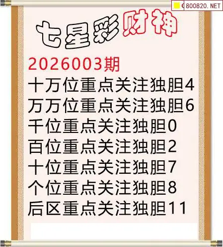 首页〉 七星彩图谜 走势图 七星彩预测七星彩图谜七星彩杀号七星彩技巧天齐图库走势图工具试机号 七星彩26003期诸葛财神独胆分析图迷 发布时间:2026-01-05 09:30 走势图:七星彩基本走势图七星彩期尾走势图 推荐:宝彩APP 免费方案 智能荐号 热点导航 公告: 天齐新版APP<中大多>上线,点击领鲜 最新文章 中大多 七星彩第2026004组选形态(限10名) 七星彩第2026004今日一注100%中奖 2026年004期龟丞相七星彩三码预测图豆豆先生2026004期七星彩三胆推荐图2026年老酒鬼004期七星彩胆码推测图百万雄师26年004期七星彩杀号图谜七星彩2026004期燕赤霞不定位杀码图毒霸26年004期七星彩杀号图谜 更多七星彩图谜 > 福彩3D 双色球 大乐透 排列三 更多> 3D胆码 3D预测 3D字谜 3D图谜 解太湖 3D条件 3D杀码 P3预测 P3图谜 P3字谜 P3条件 P3胆码 P3杀码 热点导航 天齐图库 走势图 工具图表 试机号 宝彩专家 智能荐号 菜单导航 关闭 福彩3D 3D专家 3D胆码 3D预测 3D字谜 3D图谜 解太湖 3D条件 3D杀码 3D技巧 3D走势图 体彩P3/P5 P3专家 P3预测 P3图谜 P3字谜 P3条件 P3胆码 P3杀码 P5预测 P3走势图 双色球 双色球专家 双色球预测 双色球杀号 双色球字图 双色球胆码 双色球走势 双色球技巧 大乐透 大乐透专家 大乐透预测 大乐透杀号 大乐透胆码 大乐透技巧 大乐透走势 天齐图库 七星彩 七星彩专家 七星彩预测 七星彩图谜 七星彩杀号 七星彩技巧 七星彩走势 天齐走势 七乐彩 七乐彩专家 七乐彩预测 七乐彩杀号 七乐彩技巧 七乐彩走势 热点导航 彩宝网 宝彩网 宝彩网 开奖公告 宝彩专家 牛票票