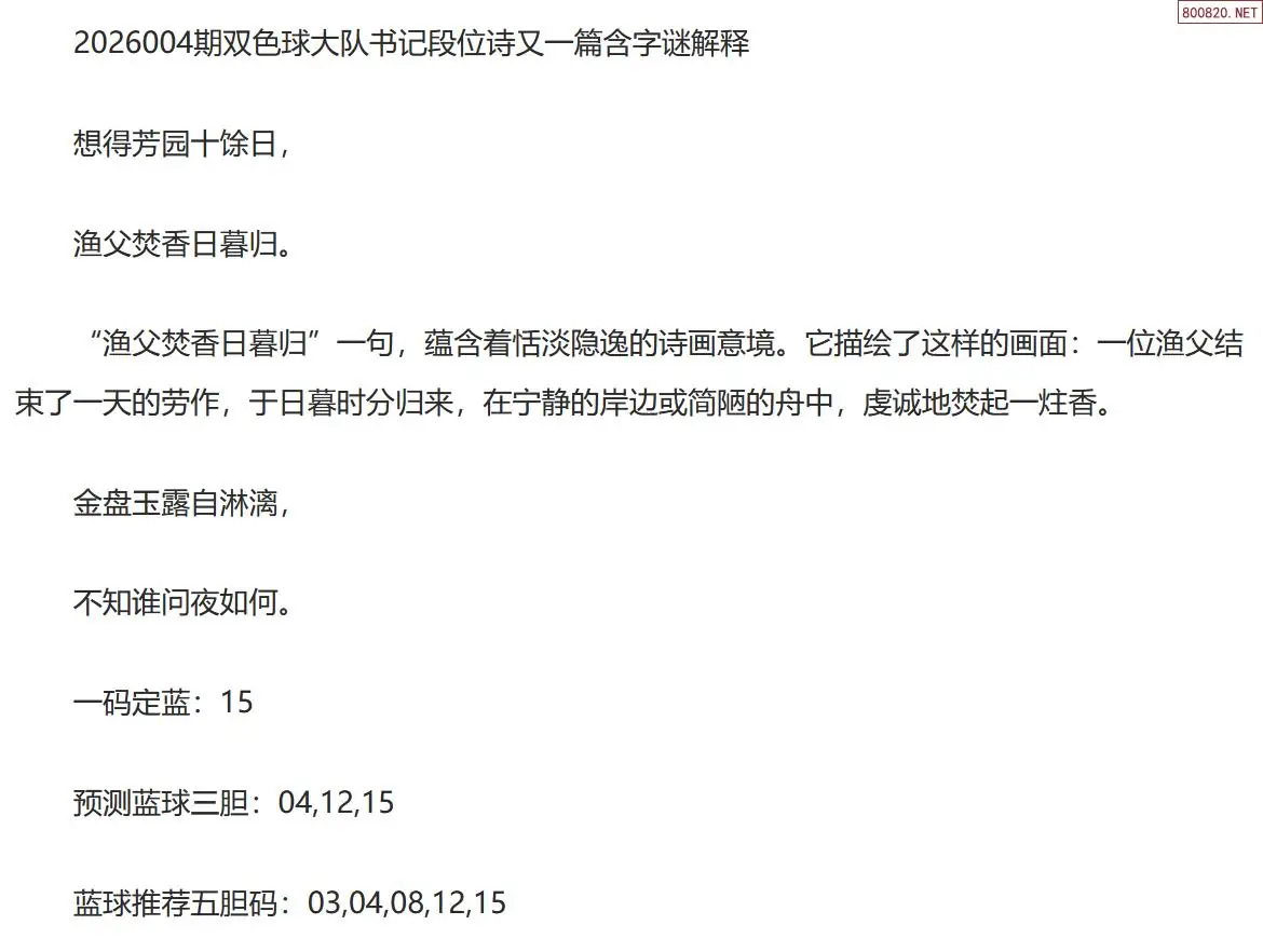 首页〉 双色球字图 走势图 双色球预测双色球杀号双色球技巧双色球字图双色球条件双色球胆码天齐图库走势图工具试机号 双色球第26004期大队书记最新段位诗谜又一篇 专题:大队书记 发布时间:2026-01-06 20:51 工具:双色球胆拖组号双色球缩水过滤 推荐:宝彩APP 免费方案 智能荐号 热点导航 公告: 天齐新版APP<中大多>上线,点击领鲜 最新文章 中大多 双色球第2026004真帝王宝图预测3D准 双色球第2026004组选形态(限10名) 藏机图2026004期天齐原创双色球藏机图迷2025004期天齐网今晚双色球字谜总汇双色球26004期图迷画迷汇总(天齐整理)双色球26年004期天吉龙头凤尾鸟语断蓝图双色球26004期牛彩字谜诗迷汇总(天齐整理)26年004期双色球峨嵋道姑预测诗 更多双色球字图 > 福彩3D 双色球 大乐透 排列三 更多> 3D胆码 3D预测 3D字谜 3D图谜 解太湖 3D条件 3D杀码 P3预测 P3图谜 P3字谜 P3条件 P3胆码 P3杀码 热点导航 天齐图库 走势图 工具图表 试机号 宝彩专家 智能荐号 菜单导航 关闭 福彩3D 3D专家 3D胆码 3D预测 3D字谜 3D图谜 解太湖 3D条件 3D杀码 3D技巧 3D走势图 体彩P3/P5 P3专家 P3预测 P3图谜 P3字谜 P3条件 P3胆码 P3杀码 P5预测 P3走势图 双色球 双色球专家 双色球预测 双色球杀号 双色球字图 双色球胆码 双色球走势 双色球技巧 大乐透 大乐透专家 大乐透预测 大乐透杀号 大乐透胆码 大乐透技巧 大乐透走势 天齐图库 七星彩 七星彩专家 七星彩预测 七星彩图谜 七星彩杀号 七星彩技巧 七星彩走势 天齐走势 七乐彩 七乐彩专家 七乐彩预测 七乐彩杀号 七乐彩技巧 七乐彩走势 热点导航 彩宝网 宝彩网 宝彩网 开奖公告 宝彩专家 牛票票