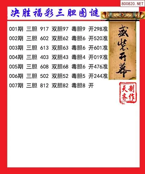 首页〉 3D图谜 走势图 3D胆码3D预测3D图谜3D字谜解太湖3D技巧3D条件3D杀码天齐图库走势图工具试机号 26年007期决胜福彩三胆3d图谜(天齐网原创) 专题:胆码图汇总 发布时间:2026-01-06 22:09 开奖:3D开奖结果3D近10期试机号 推荐:宝彩APP 免费方案 智能荐号 热点导航 公告: 天齐新版APP<中大多>上线,点击领鲜 最新文章 中大多 3D第2026009免费独胆连中五码 3D第2026009全部定位10中8 2026年009期精华布衣3D全图26年009期解太湖3d字图迷汇总彩报2026年009期3D图谜汇总(九)2026年009期3D图谜汇总(八)2026年009期3D图谜汇总(七)2026年009期3d图迷汇总(六) 更多3D图谜 > 福彩3D 双色球 大乐透 排列三 更多> 3D胆码 3D预测 3D字谜 3D图谜 解太湖 3D条件 3D杀码 P3预测 P3图谜 P3字谜 P3条件 P3胆码 P3杀码 热点导航 天齐图库 走势图 工具图表 试机号 宝彩专家 智能荐号 菜单导航 关闭 福彩3D 3D专家 3D胆码 3D预测 3D字谜 3D图谜 解太湖 3D条件 3D杀码 3D技巧 3D走势图 体彩P3/P5 P3专家 P3预测 P3图谜 P3字谜 P3条件 P3胆码 P3杀码 P5预测 P3走势图 双色球 双色球专家 双色球预测 双色球杀号 双色球字图 双色球胆码 双色球走势 双色球技巧 大乐透 大乐透专家 大乐透预测 大乐透杀号 大乐透胆码 大乐透技巧 大乐透走势 天齐图库 七星彩 七星彩专家 七星彩预测 七星彩图谜 七星彩杀号 七星彩技巧 七星彩走势 天齐走势 七乐彩 七乐彩专家 七乐彩预测 七乐彩杀号 七乐彩技巧 七乐彩走势 热点导航 彩宝网 宝彩网 宝彩网 开奖公告 宝彩专家 牛票票