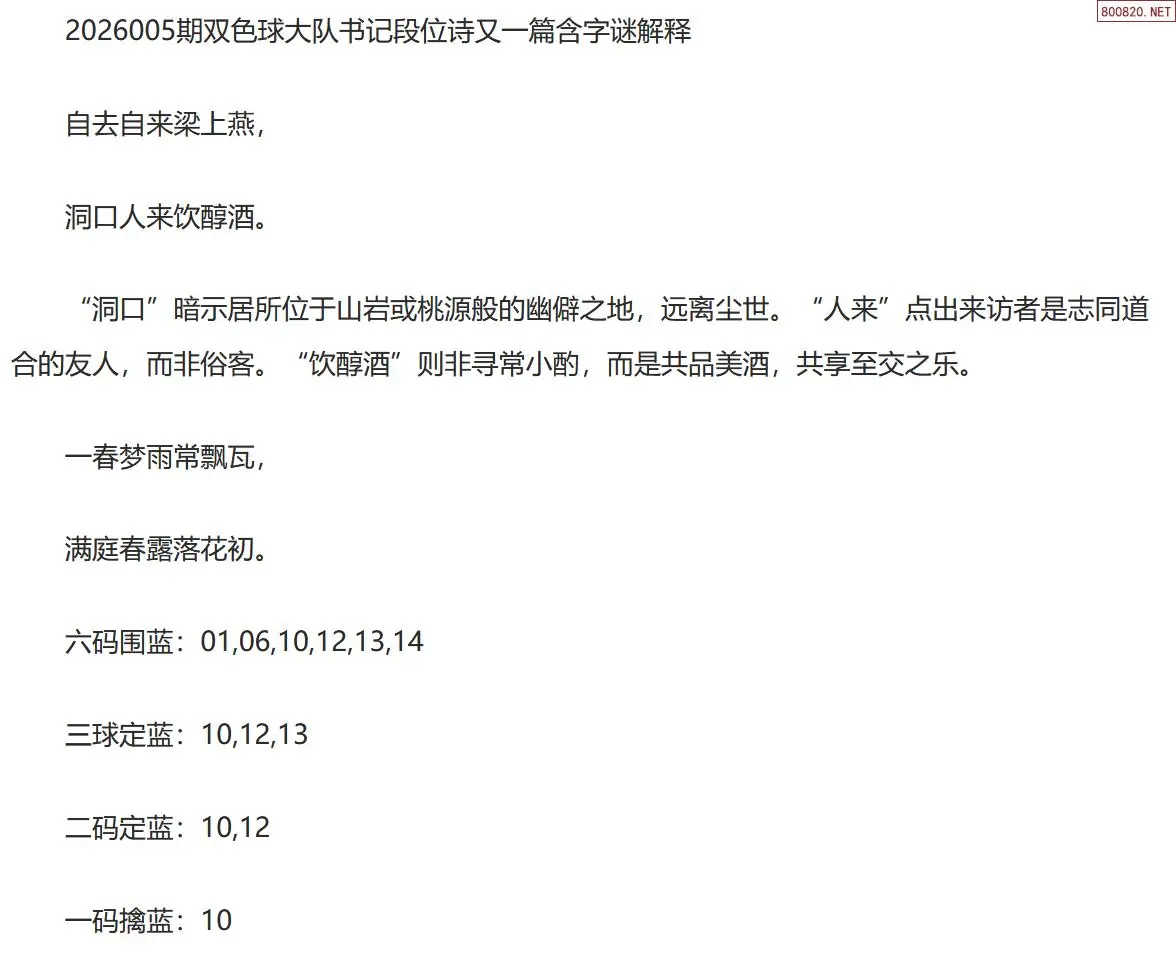 首页〉 双色球字图 走势图 双色球预测双色球杀号双色球技巧双色球字图双色球条件双色球胆码天齐图库走势图工具试机号 双色球第26005期大队书记最新段位诗谜又一篇 专题:大队书记 发布时间:2026-01-08 21:03 工具:双色球胆拖组号双色球缩水过滤 推荐:宝彩APP 免费方案 智能荐号 热点导航 公告: 天齐新版APP<中大多>上线,点击领鲜 最新文章 中大多 双色球第20260053D六鬼5码复试5中4 双色球第20260055码定位直选(限10名) 藏机图2026005期天齐原创双色球藏机图迷2025005期天齐网今晚双色球字谜总汇双色球26005期图迷画迷汇总(天齐整理)双色球26年005期天吉龙头凤尾鸟语断蓝图双色球26年009期左岸春风一语断蓝球(另版)双色球第26005期大队书记最新段位诗谜又一篇 更多双色球字图 > 福彩3D 双色球 大乐透 排列三 更多> 3D胆码 3D预测 3D字谜 3D图谜 解太湖 3D条件 3D杀码 P3预测 P3图谜 P3字谜 P3条件 P3胆码 P3杀码 热点导航 天齐图库 走势图 工具图表 试机号 宝彩专家 智能荐号 菜单导航 关闭 福彩3D 3D专家 3D胆码 3D预测 3D字谜 3D图谜 解太湖 3D条件 3D杀码 3D技巧 3D走势图 体彩P3/P5 P3专家 P3预测 P3图谜 P3字谜 P3条件 P3胆码 P3杀码 P5预测 P3走势图 双色球 双色球专家 双色球预测 双色球杀号 双色球字图 双色球胆码 双色球走势 双色球技巧 大乐透 大乐透专家 大乐透预测 大乐透杀号 大乐透胆码 大乐透技巧 大乐透走势 天齐图库 七星彩 七星彩专家 七星彩预测 七星彩图谜 七星彩杀号 七星彩技巧 七星彩走势 天齐走势 七乐彩 七乐彩专家 七乐彩预测 七乐彩杀号 七乐彩技巧 七乐彩走势 热点导航 彩宝网 宝彩网 宝彩网 开奖公告 宝彩专家 牛票票