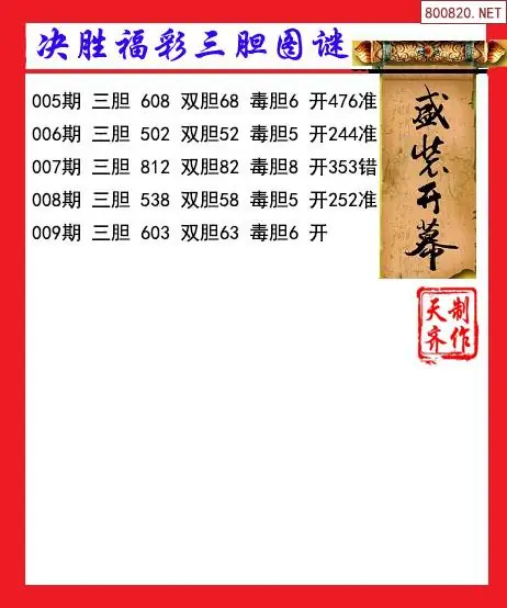 首页〉 3D图谜 走势图 3D胆码3D预测3D图谜3D字谜解太湖3D技巧3D条件3D杀码天齐图库走势图工具试机号 26年009期决胜福彩三胆3d图谜(天齐网原创) 专题:胆码图汇总 发布时间:2026-01-08 22:01 开奖:3D开奖结果3D近10期试机号 推荐:宝彩APP 免费方案 智能荐号 热点导航 公告: 天齐新版APP<中大多>上线,点击领鲜 最新文章 中大多 3D第2026010卜算子奇偶分析 3D第2026010徐文选3D直选已更新 2026年009期3D图谜汇总(九)2026年009期3D图谜汇总(八)2026年009期3D图谜汇总(七)2026年009期3d图迷汇总(六)2026年009期3d图谜汇总(五)2026年009期3D图迷汇总(四) 更多3D图谜 > 福彩3D 双色球 大乐透 排列三 更多> 3D胆码 3D预测 3D字谜 3D图谜 解太湖 3D条件 3D杀码 P3预测 P3图谜 P3字谜 P3条件 P3胆码 P3杀码 热点导航 天齐图库 走势图 工具图表 试机号 宝彩专家 智能荐号 菜单导航 关闭 福彩3D 3D专家 3D胆码 3D预测 3D字谜 3D图谜 解太湖 3D条件 3D杀码 3D技巧 3D走势图 体彩P3/P5 P3专家 P3预测 P3图谜 P3字谜 P3条件 P3胆码 P3杀码 P5预测 P3走势图 双色球 双色球专家 双色球预测 双色球杀号 双色球字图 双色球胆码 双色球走势 双色球技巧 大乐透 大乐透专家 大乐透预测 大乐透杀号 大乐透胆码 大乐透技巧 大乐透走势 天齐图库 七星彩 七星彩专家 七星彩预测 七星彩图谜 七星彩杀号 七星彩技巧 七星彩走势 天齐走势 七乐彩 七乐彩专家 七乐彩预测 七乐彩杀号 七乐彩技巧 七乐彩走势 热点导航 彩宝网 宝彩网 宝彩网 开奖公告 宝彩专家 牛票票