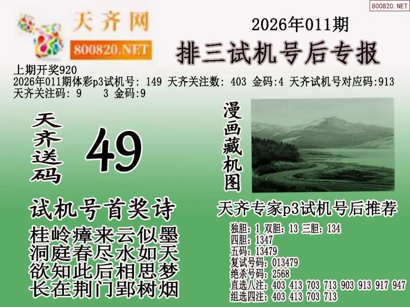 首页〉 P3图谜 走势图 P3预测P3图谜P3字谜P3技巧P3条件P3胆码P3杀码P5预测天齐图库走势图工具试机号 2026年011期体彩p3试机号后天齐网专报 发布时间:2026-01-11 17:42 工具:P3过滤缩水P3试机号走势图 推荐:宝彩APP 免费方案 智能荐号 热点导航 公告: 天齐新版APP<中大多>上线,点击领鲜 最新文章 中大多 排列三第2026012组选形态(限10名) 排列三第2026012于海滨3D杀码10中8 红黄蓝报26011期小黄报小蓝报蜂巢图26011期迷宫寻胆+天机玄机P3图谜26011期体彩P3杀码图迷汇总(天齐网整理)26011期体彩P3胆码图迷汇总(天齐网整理)26011期彩吧p3全图p3九宫图谜26011期天齐P3图谜总汇 更多P3图谜 > 福彩3D 双色球 大乐透 排列三 更多> 3D胆码 3D预测 3D字谜 3D图谜 解太湖 3D条件 3D杀码 P3预测 P3图谜 P3字谜 P3条件 P3胆码 P3杀码 热点导航 天齐图库 走势图 工具图表 试机号 宝彩专家 智能荐号 菜单导航 关闭 福彩3D 3D专家 3D胆码 3D预测 3D字谜 3D图谜 解太湖 3D条件 3D杀码 3D技巧 3D走势图 体彩P3/P5 P3专家 P3预测 P3图谜 P3字谜 P3条件 P3胆码 P3杀码 P5预测 P3走势图 双色球 双色球专家 双色球预测 双色球杀号 双色球字图 双色球胆码 双色球走势 双色球技巧 大乐透 大乐透专家 大乐透预测 大乐透杀号 大乐透胆码 大乐透技巧 大乐透走势 天齐图库 七星彩 七星彩专家 七星彩预测 七星彩图谜 七星彩杀号 七星彩技巧 七星彩走势 天齐走势 七乐彩 七乐彩专家 七乐彩预测 七乐彩杀号 七乐彩技巧 七乐彩走势 热点导航 彩宝网 宝彩网 宝彩网 开奖公告 宝彩专家 牛票票