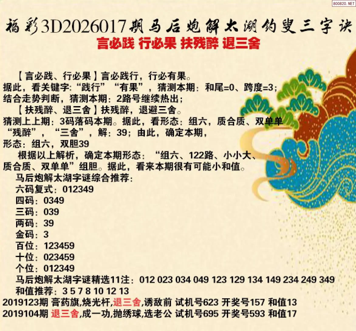 首页〉 解太湖 走势图 3D胆码3D预测3D图谜3D字谜解太湖3D技巧3D条件3D杀码天齐图库走势图工具试机号 26年017期马后炮解太湖字谜之-言必践 行必果 扶残醉 退三舍 专题:马后炮解太湖谜 发布时间:2026-01-16 20:33 开奖:3D开奖结果3D近10期试机号 推荐:宝彩APP 免费方案 智能荐号 热点导航 公告: 天齐新版APP<中大多>上线,点击领鲜 最新文章 中大多 3D第2026017免费独胆连中五码 3D第2026017直选独胆中 26017期3D丹东解太湖 天龙一语 布衣神算26年017期白鱼舟太湖钓叟三字诀解谜天涯草解太湖26年017期太湖 行必果福彩3D2026年016期[白虎]解太湖谚语 娶不起福彩3D2026年016期[青龙]解太湖字谜之七仙女福彩3D2026年016期[鱼跃龙门]今期太湖钓叟解释 到最后 更多解太湖 > 福彩3D 双色球 大乐透 排列三 更多> 3D胆码 3D预测 3D字谜 3D图谜 解太湖 3D条件 3D杀码 P3预测 P3图谜 P3字谜 P3条件 P3胆码 P3杀码 热点导航 天齐图库 走势图 工具图表 试机号 宝彩专家 智能荐号 菜单导航 关闭 福彩3D 3D专家 3D胆码 3D预测 3D字谜 3D图谜 解太湖 3D条件 3D杀码 3D技巧 3D走势图 体彩P3/P5 P3专家 P3预测 P3图谜 P3字谜 P3条件 P3胆码 P3杀码 P5预测 P3走势图 双色球 双色球专家 双色球预测 双色球杀号 双色球字图 双色球胆码 双色球走势 双色球技巧 大乐透 大乐透专家 大乐透预测 大乐透杀号 大乐透胆码 大乐透技巧 大乐透走势 天齐图库 七星彩 七星彩专家 七星彩预测 七星彩图谜 七星彩杀号 七星彩技巧 七星彩走势 天齐走势 七乐彩 七乐彩专家 七乐彩预测 七乐彩杀号 七乐彩技巧 七乐彩走势 热点导航 彩宝网 宝彩网 宝彩网 开奖公告 宝彩专家 牛票票