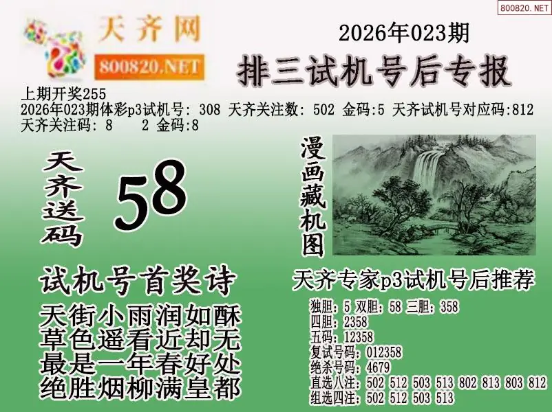 首页〉 P3图谜 走势图 P3预测P3图谜P3字谜P3技巧P3条件P3胆码P3杀码P5预测天齐图库走势图工具试机号 2026年023期体彩p3试机号后天齐网专报 发布时间:2026-01-23 17:18 工具:P3过滤缩水P3试机号走势图 推荐:宝彩APP 免费方案 智能荐号 热点导航 公告: 天齐新版APP<中大多>上线,点击领鲜 最新文章 中大多 排列三第20260233D六鬼5码复试5中4 排列三第2026023五码推荐10连中3 26023期彩吧p3全图p3九宫图谜红黄蓝报26023期小黄报小蓝报26023期体彩P3杀码图迷汇总(天齐网整理)26023期体彩P3胆码图迷汇总(天齐网整理)蜂巢图26023期迷宫寻胆+天机玄机P3图谜26023期天齐P3图谜总汇 更多P3图谜 > 福彩3D 双色球 大乐透 排列三 更多> 3D胆码 3D预测 3D字谜 3D图谜 解太湖 3D条件 3D杀码 P3预测 P3图谜 P3字谜 P3条件 P3胆码 P3杀码 热点导航 天齐图库 走势图 工具图表 试机号 宝彩专家 智能荐号 菜单导航 关闭 福彩3D 3D专家 3D胆码 3D预测 3D字谜 3D图谜 解太湖 3D条件 3D杀码 3D技巧 3D走势图 体彩P3/P5 P3专家 P3预测 P3图谜 P3字谜 P3条件 P3胆码 P3杀码 P5预测 P3走势图 双色球 双色球专家 双色球预测 双色球杀号 双色球字图 双色球胆码 双色球走势 双色球技巧 大乐透 大乐透专家 大乐透预测 大乐透杀号 大乐透胆码 大乐透技巧 大乐透走势 天齐图库 七星彩 七星彩专家 七星彩预测 七星彩图谜 七星彩杀号 七星彩技巧 七星彩走势 天齐走势 七乐彩 七乐彩专家 七乐彩预测 七乐彩杀号 七乐彩技巧 七乐彩走势 热点导航 彩宝网 宝彩网 宝彩网 开奖公告 宝彩专家 牛票票