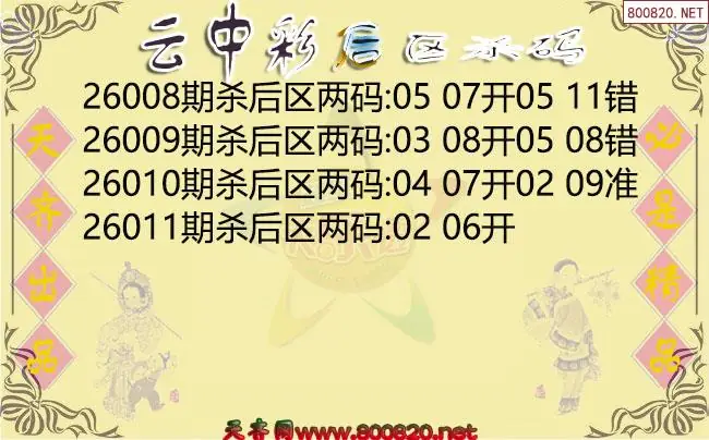 首页〉 大乐透杀号 走势图 大乐透预测大乐透杀号大乐透胆码大乐透技巧天齐图库走势图工具试机号 云中彩26年011期大乐透后区杀码图 专题:后区杀号 发布时间:2026-01-25 08:37 走势图:大乐透综合走势图大乐透期尾走势图 推荐:宝彩APP 免费方案 智能荐号 热点导航 公告: 天齐新版APP<中大多>上线,点击领鲜 最新文章 中大多 大乐透第2026011五码推荐10连中3 大乐透第2026011于海滨3D直选 大乐透2026011期[佐酒]前区杀号大乐透第26011期[羊肠小道]分析后区杀号2026011期[战江山]超级大乐透后区杀两胆大乐透第26011期[黑道风云]推荐后区杀号[权场帝王]第2026011期大乐透后区杀号[万魂之主]2026011期大乐透后区杀号预测 更多大乐透杀号 > 福彩3D 双色球 大乐透 排列三 更多> 3D胆码 3D预测 3D字谜 3D图谜 解太湖 3D条件 3D杀码 P3预测 P3图谜 P3字谜 P3条件 P3胆码 P3杀码 热点导航 天齐图库 走势图 工具图表 试机号 宝彩专家 智能荐号 菜单导航 关闭 福彩3D 3D专家 3D胆码 3D预测 3D字谜 3D图谜 解太湖 3D条件 3D杀码 3D技巧 3D走势图 体彩P3/P5 P3专家 P3预测 P3图谜 P3字谜 P3条件 P3胆码 P3杀码 P5预测 P3走势图 双色球 双色球专家 双色球预测 双色球杀号 双色球字图 双色球胆码 双色球走势 双色球技巧 大乐透 大乐透专家 大乐透预测 大乐透杀号 大乐透胆码 大乐透技巧 大乐透走势 天齐图库 七星彩 七星彩专家 七星彩预测 七星彩图谜 七星彩杀号 七星彩技巧 七星彩走势 天齐走势 七乐彩 七乐彩专家 七乐彩预测 七乐彩杀号 七乐彩技巧 七乐彩走势 热点导航 彩宝网 宝彩网 宝彩网 开奖公告 宝彩专家 牛票票