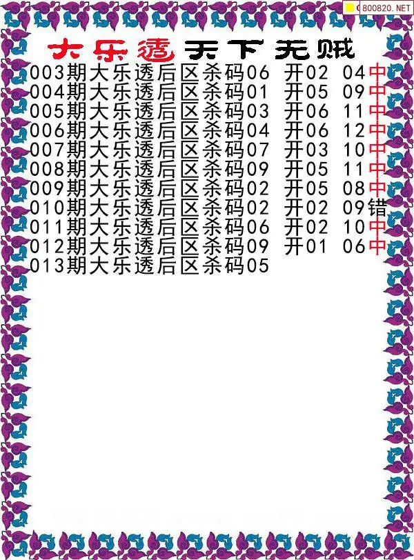 首页〉 大乐透杀号 走势图 大乐透预测大乐透杀号大乐透胆码大乐透技巧天齐图库走势图工具试机号 大乐透2026013期天下无贼后区杀号图谜 专题:后区杀号 发布时间:2026-01-28 22:59 走势图:大乐透综合走势图大乐透期尾走势图 推荐:宝彩APP 免费方案 智能荐号 热点导航 公告: 天齐新版APP<中大多>上线,点击领鲜 最新文章 中大多 大乐透第2026013卜算子奇偶分析 大乐透第2026013徐文选3D独胆已连准 26年第013期[红色风帆]大乐透后区杀码26年第013期[古月神仙]大乐透后区绝杀三胆26年第013期[天堂泪]大乐透后区杀4码26年第013期[堕天翼]大乐透后区杀2码26年第013期[孤独无败]大乐透后区绝杀两码26年第013期[蜡笔小新]大乐透后区绝杀2码 更多大乐透杀号 > 福彩3D 双色球 大乐透 排列三 更多> 3D胆码 3D预测 3D字谜 3D图谜 解太湖 3D条件 3D杀码 P3预测 P3图谜 P3字谜 P3条件 P3胆码 P3杀码 热点导航 天齐图库 走势图 工具图表 试机号 宝彩专家 智能荐号 菜单导航 关闭 福彩3D 3D专家 3D胆码 3D预测 3D字谜 3D图谜 解太湖 3D条件 3D杀码 3D技巧 3D走势图 体彩P3/P5 P3专家 P3预测 P3图谜 P3字谜 P3条件 P3胆码 P3杀码 P5预测 P3走势图 双色球 双色球专家 双色球预测 双色球杀号 双色球字图 双色球胆码 双色球走势 双色球技巧 大乐透 大乐透专家 大乐透预测 大乐透杀号 大乐透胆码 大乐透技巧 大乐透走势 天齐图库 七星彩 七星彩专家 七星彩预测 七星彩图谜 七星彩杀号 七星彩技巧 七星彩走势 天齐走势 七乐彩 七乐彩专家 七乐彩预测 七乐彩杀号 七乐彩技巧 七乐彩走势 热点导航 彩宝网 宝彩网 宝彩网 开奖公告 宝彩专家 牛票票