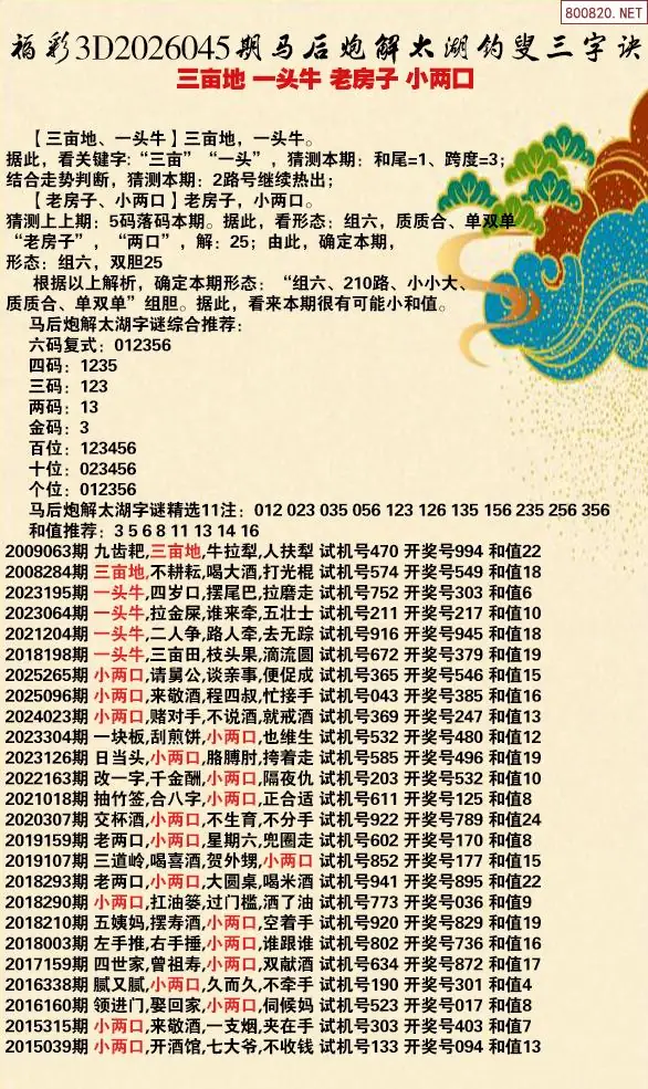 首页〉 解太湖 走势图 3D胆码3D预测3D图谜3D字谜解太湖3D技巧3D条件3D杀码天齐图库走势图工具试机号 26年045期马后炮解太湖字谜之-三亩地 一头牛 老房子 小两口 专题:马后炮解太湖谜 发布时间:2026-02-13 20:34 开奖:3D开奖结果3D近10期试机号 推荐:宝彩APP 免费方案 智能荐号 热点导航 公告: 天齐新版APP<中大多>上线,点击领鲜 最新文章 中大多 3D第2026045直选独胆中 3D第2026045于海滨3D直选免费领 26045期3D丹东解太湖 天龙一语 布衣神算26045期太湖字谜钓叟 - 三亩地 一头牛 老房子 小两口福彩3D2026年044期[莲叶]解析太湖钓叟福彩3D2026年044期[冰天雪地]分解字谜太湖 钱不舍福彩3D2026年044期[语花香]注解太湖玄机 一原则福彩3D2026年044期[九转]太湖今天释义 钱不舍 更多解太湖 > 福彩3D 双色球 大乐透 排列三 更多> 3D胆码 3D预测 3D字谜 3D图谜 解太湖 3D条件 3D杀码 P3预测 P3图谜 P3字谜 P3条件 P3胆码 P3杀码 热点导航 天齐图库 走势图 工具图表 试机号 宝彩专家 智能荐号 菜单导航 关闭 福彩3D 3D专家 3D胆码 3D预测 3D字谜 3D图谜 解太湖 3D条件 3D杀码 3D技巧 3D走势图 体彩P3/P5 P3专家 P3预测 P3图谜 P3字谜 P3条件 P3胆码 P3杀码 P5预测 P3走势图 双色球 双色球专家 双色球预测 双色球杀号 双色球字图 双色球胆码 双色球走势 双色球技巧 大乐透 大乐透专家 大乐透预测 大乐透杀号 大乐透胆码 大乐透技巧 大乐透走势 天齐图库 七星彩 七星彩专家 七星彩预测 七星彩图谜 七星彩杀号 七星彩技巧 七星彩走势 天齐走势 七乐彩 七乐彩专家 七乐彩预测 七乐彩杀号 七乐彩技巧 七乐彩走势 热点导航 彩宝网 宝彩网 宝彩网 开奖公告 宝彩专家 牛票票