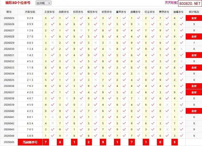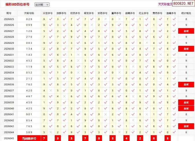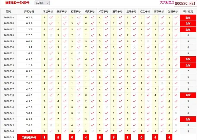 首页〉 3D杀码 走势图 3D胆码3D预测3D图谜3D字谜解太湖3D技巧3D条件3D杀码天齐图库走势图工具试机号 26045期彩宝贝福彩3D百十个位杀号 专题:3D杀码十专家 发布时间:2026-02-23 11:34 开奖:3D开奖结果3D近10期试机号 推荐:宝彩APP 免费方案 智能荐号 热点导航 公告: 天齐新版APP<中大多>上线,点击领鲜 最新文章 中大多 3D第2026045真帝王宝图预测3D准 3D第2026045徐文选3D独胆已连准 26045期彩宝贝福彩3D组选杀号26045期彩宝贝福彩3D百十个位杀号26年045期福彩3d彩经十大专家组选杀号26年045期福彩3d彩经十大专家直选杀号福彩3d26年045期澳客专家杀组选号码福彩3d26年045期澳客专家杀直选号码 更多3D杀码 > 福彩3D 双色球 大乐透 排列三 更多> 3D胆码 3D预测 3D字谜 3D图谜 解太湖 3D条件 3D杀码 P3预测 P3图谜 P3字谜 P3条件 P3胆码 P3杀码 热点导航 天齐图库 走势图 工具图表 试机号 宝彩专家 智能荐号 菜单导航 关闭 福彩3D 3D专家 3D胆码 3D预测 3D字谜 3D图谜 解太湖 3D条件 3D杀码 3D技巧 3D走势图 体彩P3/P5 P3专家 P3预测 P3图谜 P3字谜 P3条件 P3胆码 P3杀码 P5预测 P3走势图 双色球 双色球专家 双色球预测 双色球杀号 双色球字图 双色球胆码 双色球走势 双色球技巧 大乐透 大乐透专家 大乐透预测 大乐透杀号 大乐透胆码 大乐透技巧 大乐透走势 天齐图库 七星彩 七星彩专家 七星彩预测 七星彩图谜 七星彩杀号 七星彩技巧 七星彩走势 天齐走势 七乐彩 七乐彩专家 七乐彩预测 七乐彩杀号 七乐彩技巧 七乐彩走势 热点导航 彩宝网 宝彩网 宝彩网 开奖公告 宝彩专家 牛票票