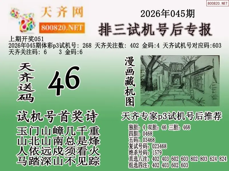 首页〉 P3图谜 走势图 P3预测P3图谜P3字谜P3技巧P3条件P3胆码P3杀码P5预测天齐图库走势图工具试机号 2026年045期体彩p3试机号后天齐网专报 发布时间:2026-02-24 17:21 工具:P3过滤缩水P3试机号走势图 推荐:宝彩APP 免费方案 智能荐号 热点导航 公告: 天齐新版APP<中大多>上线,点击领鲜 最新文章 中大多 排列三第2026045于海滨3D五码复试 排列三第2026045本期直选一注免费领取 红黄蓝报26045期小黄报小蓝报26045期体彩P3杀码图迷汇总(天齐网整理)26045期体彩P3胆码图迷汇总(天齐网整理)蜂巢图26045期迷宫寻胆+天机玄机P3图谜26045期彩吧p3全图p3九宫图谜26045期天齐P3图谜总汇 更多P3图谜 > 福彩3D 双色球 大乐透 排列三 更多> 3D胆码 3D预测 3D字谜 3D图谜 解太湖 3D条件 3D杀码 P3预测 P3图谜 P3字谜 P3条件 P3胆码 P3杀码 热点导航 天齐图库 走势图 工具图表 试机号 宝彩专家 智能荐号 菜单导航 关闭 福彩3D 3D专家 3D胆码 3D预测 3D字谜 3D图谜 解太湖 3D条件 3D杀码 3D技巧 3D走势图 体彩P3/P5 P3专家 P3预测 P3图谜 P3字谜 P3条件 P3胆码 P3杀码 P5预测 P3走势图 双色球 双色球专家 双色球预测 双色球杀号 双色球字图 双色球胆码 双色球走势 双色球技巧 大乐透 大乐透专家 大乐透预测 大乐透杀号 大乐透胆码 大乐透技巧 大乐透走势 天齐图库 七星彩 七星彩专家 七星彩预测 七星彩图谜 七星彩杀号 七星彩技巧 七星彩走势 天齐走势 七乐彩 七乐彩专家 七乐彩预测 七乐彩杀号 七乐彩技巧 七乐彩走势 热点导航 彩宝网 宝彩网 宝彩网 开奖公告 宝彩专家 牛票票