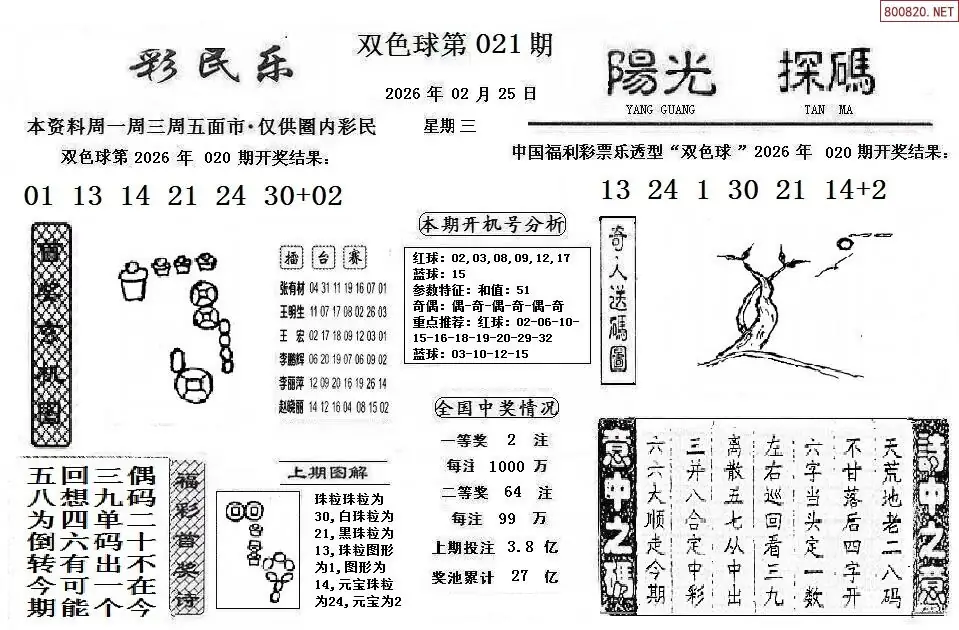 首页〉 双色球字图 走势图 双色球预测双色球杀号双色球技巧双色球字图双色球条件双色球胆码天齐图库走势图工具试机号 双色球26年021期阳光探码+彩民乐图谜 专题:彩民乐阳光探码 发布时间:2026-02-25 17:05 工具:双色球胆拖组号双色球缩水过滤 推荐:宝彩APP 免费方案 智能荐号 热点导航 公告: 天齐新版APP<中大多>上线,点击领鲜 最新文章 中大多 双色球第2026021布衣专家精准推荐 双色球第2026021组选形态(限10名) 双色球26年021期阳光探码+彩民乐图谜26年021期双色球联销图(网络版)26年021期天齐网今晚双色球图谜总汇藏机图2026021期天齐原创双色球藏机图迷2025021期天齐网今晚双色球字谜总汇双色球26021期图迷画迷汇总(天齐整理) 更多双色球字图 > 福彩3D 双色球 大乐透 排列三 更多> 3D胆码 3D预测 3D字谜 3D图谜 解太湖 3D条件 3D杀码 P3预测 P3图谜 P3字谜 P3条件 P3胆码 P3杀码 热点导航 天齐图库 走势图 工具图表 试机号 宝彩专家 智能荐号 菜单导航 关闭 福彩3D 3D专家 3D胆码 3D预测 3D字谜 3D图谜 解太湖 3D条件 3D杀码 3D技巧 3D走势图 体彩P3/P5 P3专家 P3预测 P3图谜 P3字谜 P3条件 P3胆码 P3杀码 P5预测 P3走势图 双色球 双色球专家 双色球预测 双色球杀号 双色球字图 双色球胆码 双色球走势 双色球技巧 大乐透 大乐透专家 大乐透预测 大乐透杀号 大乐透胆码 大乐透技巧 大乐透走势 天齐图库 七星彩 七星彩专家 七星彩预测 七星彩图谜 七星彩杀号 七星彩技巧 七星彩走势 天齐走势 七乐彩 七乐彩专家 七乐彩预测 七乐彩杀号 七乐彩技巧 七乐彩走势 热点导航 彩宝网 宝彩网 宝彩网 开奖公告 宝彩专家 牛票票