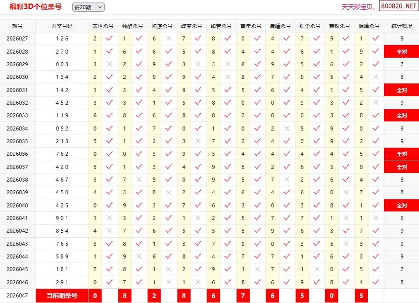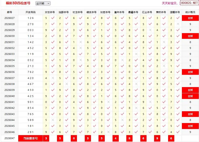 首页〉 3D杀码 走势图 3D胆码3D预测3D图谜3D字谜解太湖3D技巧3D条件3D杀码天齐图库走势图工具试机号 26047期彩宝贝福彩3D百十个位杀号 专题:3D杀码十专家 发布时间:2026-02-26 11:05 开奖:3D开奖结果3D近10期试机号 推荐:宝彩APP 免费方案 智能荐号 热点导航 公告: 天齐新版APP<中大多>上线,点击领鲜 最新文章 中大多 3D第2026047小蓝精灵独胆9中6 3D第2026047一码毒蓝连中8期 26年047期[浮梦一生]3d杀一胆 46错1226年047期[醉相思]3d杀一码 46错1126年047期[忆往昔]3d本期杀号 46错1626年047期[顾棋]本期3d杀号 46错1226年047期[孤影梵然]杀双胆 46错2626年047期[流星风雨]3d杀一码 46错16 更多3D杀码 > 福彩3D 双色球 大乐透 排列三 更多> 3D胆码 3D预测 3D字谜 3D图谜 解太湖 3D条件 3D杀码 P3预测 P3图谜 P3字谜 P3条件 P3胆码 P3杀码 热点导航 天齐图库 走势图 工具图表 试机号 宝彩专家 智能荐号 菜单导航 关闭 福彩3D 3D专家 3D胆码 3D预测 3D字谜 3D图谜 解太湖 3D条件 3D杀码 3D技巧 3D走势图 体彩P3/P5 P3专家 P3预测 P3图谜 P3字谜 P3条件 P3胆码 P3杀码 P5预测 P3走势图 双色球 双色球专家 双色球预测 双色球杀号 双色球字图 双色球胆码 双色球走势 双色球技巧 大乐透 大乐透专家 大乐透预测 大乐透杀号 大乐透胆码 大乐透技巧 大乐透走势 天齐图库 七星彩 七星彩专家 七星彩预测 七星彩图谜 七星彩杀号 七星彩技巧 七星彩走势 天齐走势 七乐彩 七乐彩专家 七乐彩预测 七乐彩杀号 七乐彩技巧 七乐彩走势 热点导航 彩宝网 宝彩网 宝彩网 开奖公告 宝彩专家 牛票票