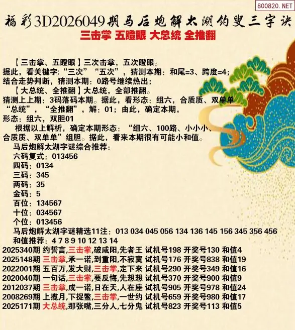 首页〉 解太湖 走势图 3D胆码3D预测3D图谜3D字谜解太湖3D技巧3D条件3D杀码天齐图库走势图工具试机号 26年049期马后炮解太湖字谜之-三击掌 五瞪眼 大总统 全推翻 专题:马后炮解太湖谜 发布时间:2026-02-27 20:31 开奖:3D开奖结果3D近10期试机号 推荐:宝彩APP 免费方案 智能荐号 热点导航 公告: 天齐新版APP<中大多>上线,点击领鲜 最新文章 中大多 3D第2026049徐文选3D独胆已连准 3D第2026049双飞独胆免费领取 26049期3D丹东解太湖 天龙一语 布衣神算26年049期孔方来萃专解太湖钓叟三字诀26049期太湖字谜钓叟 - 三击掌 五瞪眼 大总统 全推翻26年049期白鱼舟太湖钓叟三字诀解谜天涯草解太湖26年049期太湖 五瞪眼26年048期洞庭游侠破解太湖之谜 算八卦 更多解太湖 > 福彩3D 双色球 大乐透 排列三 更多> 3D胆码 3D预测 3D字谜 3D图谜 解太湖 3D条件 3D杀码 P3预测 P3图谜 P3字谜 P3条件 P3胆码 P3杀码 热点导航 天齐图库 走势图 工具图表 试机号 宝彩专家 智能荐号 菜单导航 关闭 福彩3D 3D专家 3D胆码 3D预测 3D字谜 3D图谜 解太湖 3D条件 3D杀码 3D技巧 3D走势图 体彩P3/P5 P3专家 P3预测 P3图谜 P3字谜 P3条件 P3胆码 P3杀码 P5预测 P3走势图 双色球 双色球专家 双色球预测 双色球杀号 双色球字图 双色球胆码 双色球走势 双色球技巧 大乐透 大乐透专家 大乐透预测 大乐透杀号 大乐透胆码 大乐透技巧 大乐透走势 天齐图库 七星彩 七星彩专家 七星彩预测 七星彩图谜 七星彩杀号 七星彩技巧 七星彩走势 天齐走势 七乐彩 七乐彩专家 七乐彩预测 七乐彩杀号 七乐彩技巧 七乐彩走势 热点导航 彩宝网 宝彩网 宝彩网 开奖公告 宝彩专家 牛票票