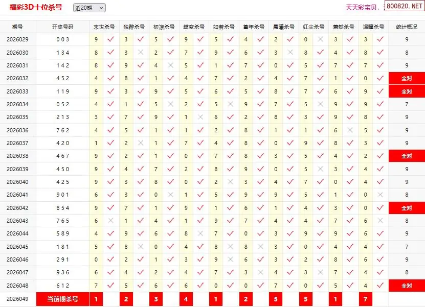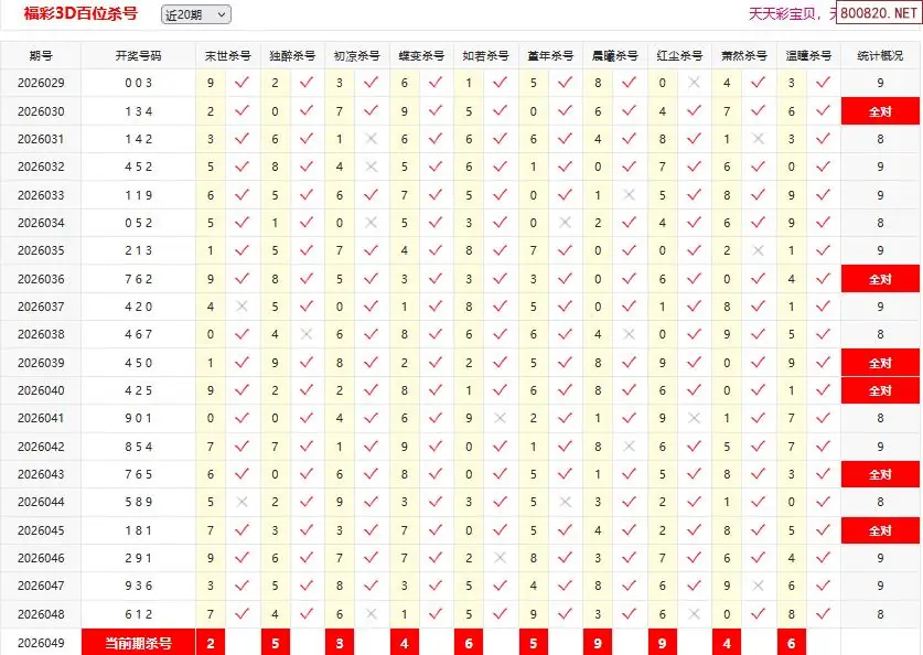 首页〉 3D杀码 走势图 3D胆码3D预测3D图谜3D字谜解太湖3D技巧3D条件3D杀码天齐图库走势图工具试机号 26049期彩宝贝福彩3D百十个位杀号 专题:3D杀码十专家 发布时间:2026-02-28 10:47 开奖:3D开奖结果3D近10期试机号 推荐:宝彩APP 免费方案 智能荐号 热点导航 公告: 天齐新版APP<中大多>上线,点击领鲜 最新文章 中大多 3D第2026049于海滨3D直选 3D第2026049高手3码独胆精准 26年第049期各路专家杀个位3d杀号总汇26年第049期各路专家杀十位3d杀号总汇26年第049期各路专家杀百位3d杀号总汇26年049期[浮梦一生]3d杀一胆 48错1226年049期[醉相思]3d杀一码 48错1126年049期[忆往昔]3d本期杀号 48错16 更多3D杀码 > 福彩3D 双色球 大乐透 排列三 更多> 3D胆码 3D预测 3D字谜 3D图谜 解太湖 3D条件 3D杀码 P3预测 P3图谜 P3字谜 P3条件 P3胆码 P3杀码 热点导航 天齐图库 走势图 工具图表 试机号 宝彩专家 智能荐号 菜单导航 关闭 福彩3D 3D专家 3D胆码 3D预测 3D字谜 3D图谜 解太湖 3D条件 3D杀码 3D技巧 3D走势图 体彩P3/P5 P3专家 P3预测 P3图谜 P3字谜 P3条件 P3胆码 P3杀码 P5预测 P3走势图 双色球 双色球专家 双色球预测 双色球杀号 双色球字图 双色球胆码 双色球走势 双色球技巧 大乐透 大乐透专家 大乐透预测 大乐透杀号 大乐透胆码 大乐透技巧 大乐透走势 天齐图库 七星彩 七星彩专家 七星彩预测 七星彩图谜 七星彩杀号 七星彩技巧 七星彩走势 天齐走势 七乐彩 七乐彩专家 七乐彩预测 七乐彩杀号 七乐彩技巧 七乐彩走势 热点导航 彩宝网 宝彩网 宝彩网 开奖公告 宝彩专家 牛票票