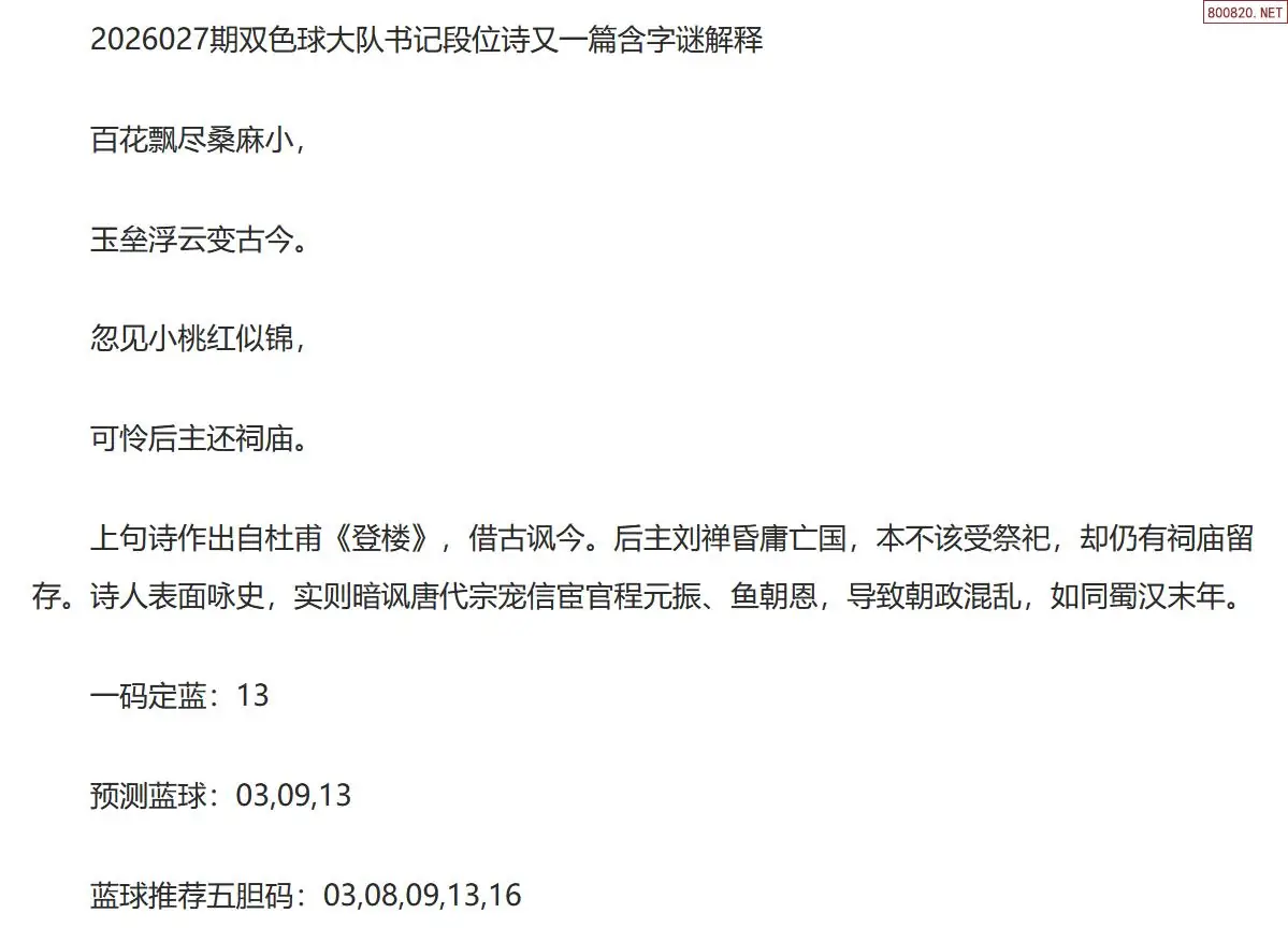 首页〉 双色球字图 走势图 双色球预测双色球杀号双色球技巧双色球字图双色球条件双色球胆码天齐图库走势图工具试机号 双色球第26027期大队书记最新段位诗谜又一篇 专题:大队书记 发布时间:2026-03-10 20:53 工具:双色球胆拖组号双色球缩水过滤 推荐:宝彩APP 免费方案 智能荐号 热点导航 公告: 天齐新版APP<中大多>上线,点击领鲜 最新文章 中大多 双色球第2026027小蓝精灵独胆9中6 双色球第2026027真帝王宝图预测3D准 藏机图2026027期天齐原创双色球藏机图迷2025027期天齐网今晚双色球字谜总汇双色球26027期图迷画迷汇总(天齐整理)双色球26年027期天吉龙头凤尾鸟语断蓝图26年027期大胜寨双色球中奖真言双色球26027期牛彩字谜诗迷汇总(天齐整理) 更多双色球字图 > 福彩3D 双色球 大乐透 排列三 更多> 3D胆码 3D预测 3D字谜 3D图谜 解太湖 3D条件 3D杀码 P3预测 P3图谜 P3字谜 P3条件 P3胆码 P3杀码 热点导航 天齐图库 走势图 工具图表 试机号 宝彩专家 智能荐号 菜单导航 关闭 福彩3D 3D专家 3D胆码 3D预测 3D字谜 3D图谜 解太湖 3D条件 3D杀码 3D技巧 3D走势图 体彩P3/P5 P3专家 P3预测 P3图谜 P3字谜 P3条件 P3胆码 P3杀码 P5预测 P3走势图 双色球 双色球专家 双色球预测 双色球杀号 双色球字图 双色球胆码 双色球走势 双色球技巧 大乐透 大乐透专家 大乐透预测 大乐透杀号 大乐透胆码 大乐透技巧 大乐透走势 天齐图库 七星彩 七星彩专家 七星彩预测 七星彩图谜 七星彩杀号 七星彩技巧 七星彩走势 天齐走势 七乐彩 七乐彩专家 七乐彩预测 七乐彩杀号 七乐彩技巧 七乐彩走势 热点导航 彩宝网 宝彩网 宝彩网 开奖公告 宝彩专家 牛票票
