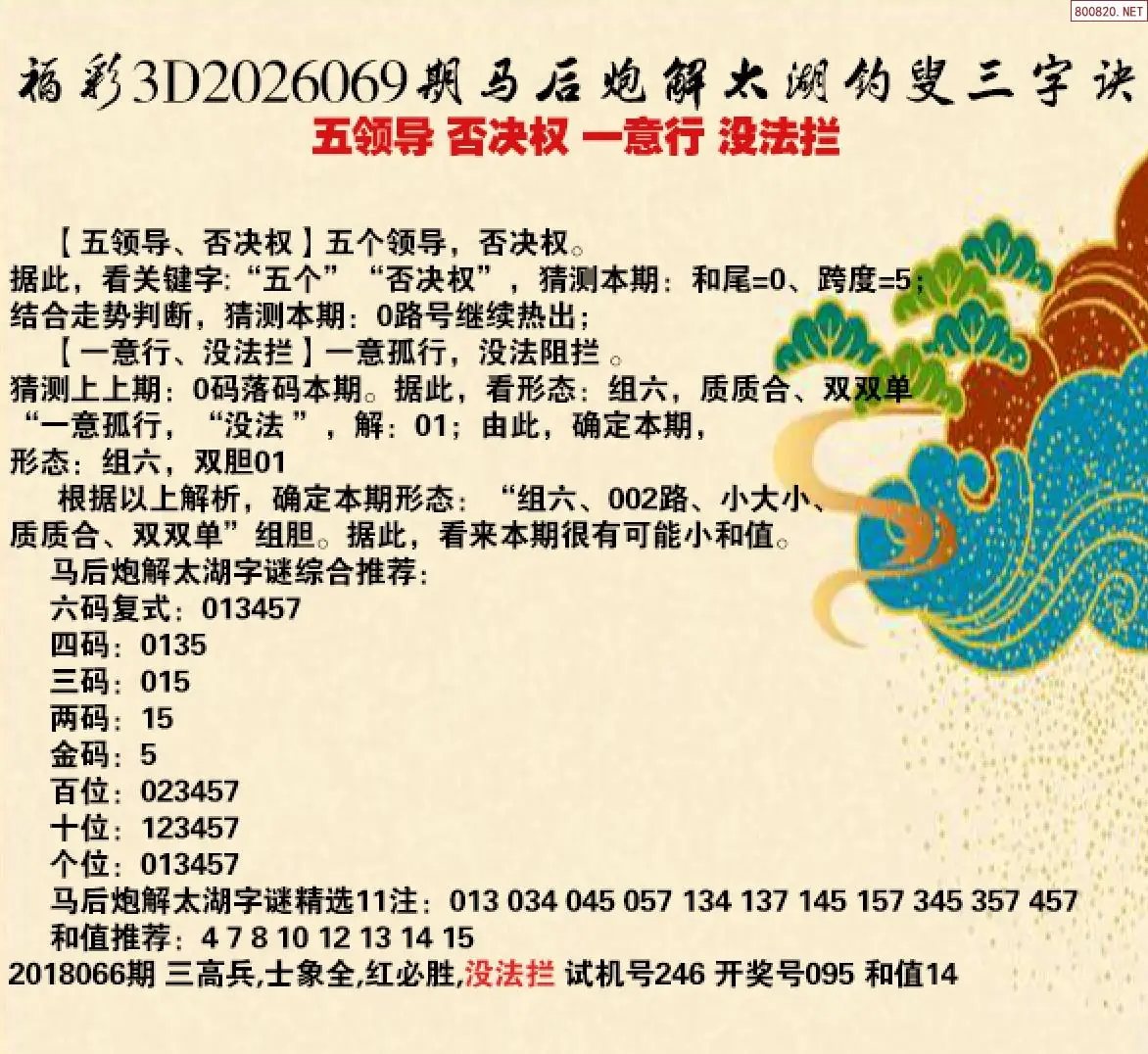 首页〉 解太湖 走势图 3D胆码3D预测3D图谜3D字谜解太湖3D技巧3D条件3D杀码天齐图库走势图工具试机号 26年069期马后炮解太湖字谜之-五领导 否决权 一意行 没法拦 专题:马后炮解太湖谜 发布时间:2026-03-19 20:31 开奖:3D开奖结果3D近10期试机号 推荐:宝彩APP 免费方案 智能荐号 热点导航 公告: 天齐新版APP<中大多>上线,点击领鲜 最新文章 中大多 3D第2026069于海滨3D胆码预测 3D第20260693D六鬼5码复试5中4 26年068期马后炮解太湖字谜之-夫酒局 妻来电 八里远 立回还068期天齐网解本期太湖字谜钓叟-夫酒局 妻来电 八里远 立回还26068期3D丹东解太湖 天龙一语 布衣神算26年068期 3D专家解今日太湖字谜汇总(天齐网整理汇总)26年068期孔方来萃专解太湖钓叟三字诀26068期太湖字谜钓叟 - 夫酒局 妻来电 八里远 立回还 更多解太湖 > 福彩3D 双色球 大乐透 排列三 更多> 3D胆码 3D预测 3D字谜 3D图谜 解太湖 3D条件 3D杀码 P3预测 P3图谜 P3字谜 P3条件 P3胆码 P3杀码 热点导航 天齐图库 走势图 工具图表 试机号 宝彩专家 智能荐号 菜单导航 关闭 福彩3D 3D专家 3D胆码 3D预测 3D字谜 3D图谜 解太湖 3D条件 3D杀码 3D技巧 3D走势图 体彩P3/P5 P3专家 P3预测 P3图谜 P3字谜 P3条件 P3胆码 P3杀码 P5预测 P3走势图 双色球 双色球专家 双色球预测 双色球杀号 双色球字图 双色球胆码 双色球走势 双色球技巧 大乐透 大乐透专家 大乐透预测 大乐透杀号 大乐透胆码 大乐透技巧 大乐透走势 天齐图库 七星彩 七星彩专家 七星彩预测 七星彩图谜 七星彩杀号 七星彩技巧 七星彩走势 天齐走势 七乐彩 七乐彩专家 七乐彩预测 七乐彩杀号 七乐彩技巧 七乐彩走势 热点导航 彩宝网 宝彩网 宝彩网 开奖公告 宝彩专家 牛票票