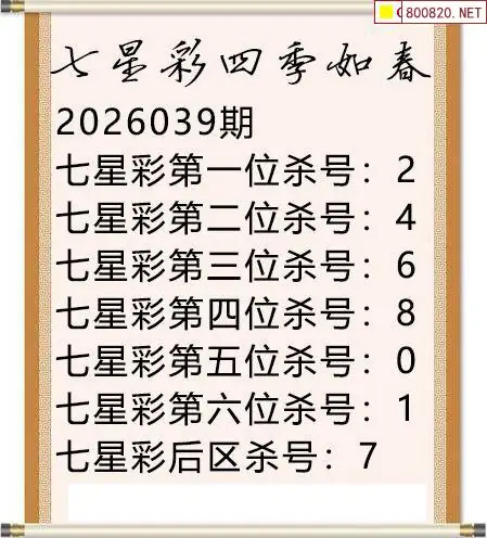 首页〉 七星彩图谜 走势图 七星彩预测七星彩图谜七星彩杀号七星彩技巧天齐图库走势图工具试机号 七星彩26年第039期四季如春定位杀码图迷 发布时间:2026-04-07 20:41 走势图:七星彩基本走势图七星彩期尾走势图 推荐:宝彩APP 免费方案 智能荐号 热点导航 公告: 天齐新版APP<中大多>上线,点击领鲜 最新文章 中大多 七星彩第2026039真帝王宝图预测3D准 七星彩第2026039徐文轩3D独胆 七星彩26039期诸葛财神独胆分析图迷七星彩2026039期金色年华胆码推荐图迷七星彩26年第039期四季如春定位杀码图迷七星彩26039期繁华落尽胆组图迷七星彩26年039期乱世佳人胆码图迷2026年038期龟丞相七星彩三码预测图 更多七星彩图谜 > 福彩3D 双色球 大乐透 排列三 更多> 3D胆码 3D预测 3D字谜 3D图谜 解太湖 3D条件 3D杀码 P3预测 P3图谜 P3字谜 P3条件 P3胆码 P3杀码 热点导航 天齐图库 走势图 工具图表 试机号 宝彩专家 智能荐号 菜单导航 关闭 福彩3D 3D专家 3D胆码 3D预测 3D字谜 3D图谜 解太湖 3D条件 3D杀码 3D技巧 3D走势图 体彩P3/P5 P3专家 P3预测 P3图谜 P3字谜 P3条件 P3胆码 P3杀码 P5预测 P3走势图 双色球 双色球专家 双色球预测 双色球杀号 双色球字图 双色球胆码 双色球走势 双色球技巧 大乐透 大乐透专家 大乐透预测 大乐透杀号 大乐透胆码 大乐透技巧 大乐透走势 天齐图库 七星彩 七星彩专家 七星彩预测 七星彩图谜 七星彩杀号 七星彩技巧 七星彩走势 天齐走势 七乐彩 七乐彩专家 七乐彩预测 七乐彩杀号 七乐彩技巧 七乐彩走势 热点导航 彩宝网 宝彩网 宝彩网 开奖公告 宝彩专家 牛票票