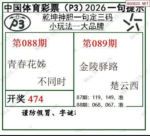 首页〉 P3图谜 走势图 P3预测P3图谜P3字谜P3技巧P3条件P3胆码P3杀码P5预测天齐图库走势图工具试机号 2026089期乾坤一句p3定三码图谜 专题:乾坤一句p3 发布时间:2026-04-08 21:56 工具:P3过滤缩水P3试机号走势图 推荐:宝彩APP 免费方案 智能荐号 热点导航 公告: 天齐新版APP<中大多>上线,点击领鲜 最新文章 中大多 排列三第2026089布衣专家精准推荐 排列三第2026089徐文选3D直选已更新 26089期彩吧p3全图p3九宫图谜26089期天齐P3图谜总汇2026089期p3北盟天机图+p3仙机图谜26089期丹东p3图汇总分析金胆图谜2026089期乾坤一句p3定三码图谜26089期体彩P3小熊猫图迷 更多P3图谜 > 福彩3D 双色球 大乐透 排列三 更多> 3D胆码 3D预测 3D字谜 3D图谜 解太湖 3D条件 3D杀码 P3预测 P3图谜 P3字谜 P3条件 P3胆码 P3杀码 热点导航 天齐图库 走势图 工具图表 试机号 宝彩专家 智能荐号 菜单导航 关闭 福彩3D 3D专家 3D胆码 3D预测 3D字谜 3D图谜 解太湖 3D条件 3D杀码 3D技巧 3D走势图 体彩P3/P5 P3专家 P3预测 P3图谜 P3字谜 P3条件 P3胆码 P3杀码 P5预测 P3走势图 双色球 双色球专家 双色球预测 双色球杀号 双色球字图 双色球胆码 双色球走势 双色球技巧 大乐透 大乐透专家 大乐透预测 大乐透杀号 大乐透胆码 大乐透技巧 大乐透走势 天齐图库 七星彩 七星彩专家 七星彩预测 七星彩图谜 七星彩杀号 七星彩技巧 七星彩走势 天齐走势 七乐彩 七乐彩专家 七乐彩预测 七乐彩杀号 七乐彩技巧 七乐彩走势 热点导航 彩宝网 宝彩网 宝彩网 开奖公告 宝彩专家 牛票票