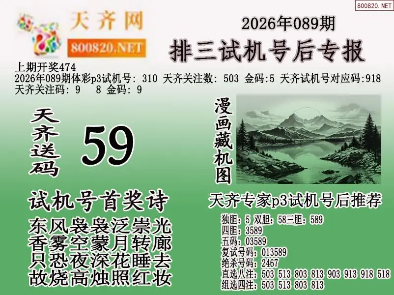 首页〉 P3图谜 走势图 P3预测P3图谜P3字谜P3技巧P3条件P3胆码P3杀码P5预测天齐图库走势图工具试机号 2026年089期体彩p3试机号后天齐网专报 发布时间:2026-04-09 17:13 工具:P3过滤缩水P3试机号走势图 推荐:宝彩APP 免费方案 智能荐号 热点导航 公告: 天齐新版APP<中大多>上线,点击领鲜 最新文章 中大多 排列三第2026089于海滨3D直选 排列三第2026089免费独胆连中五码 红黄蓝报26089期小黄报小蓝报26089期体彩P3杀码图迷汇总(天齐网整理)26089期体彩P3胆码图迷汇总(天齐网整理)蜂巢图26089期迷宫寻胆+天机玄机P3图谜26089期彩吧p3全图p3九宫图谜26089期天齐P3图谜总汇 更多P3图谜 > 福彩3D 双色球 大乐透 排列三 更多> 3D胆码 3D预测 3D字谜 3D图谜 解太湖 3D条件 3D杀码 P3预测 P3图谜 P3字谜 P3条件 P3胆码 P3杀码 热点导航 天齐图库 走势图 工具图表 试机号 宝彩专家 智能荐号 菜单导航 关闭 福彩3D 3D专家 3D胆码 3D预测 3D字谜 3D图谜 解太湖 3D条件 3D杀码 3D技巧 3D走势图 体彩P3/P5 P3专家 P3预测 P3图谜 P3字谜 P3条件 P3胆码 P3杀码 P5预测 P3走势图 双色球 双色球专家 双色球预测 双色球杀号 双色球字图 双色球胆码 双色球走势 双色球技巧 大乐透 大乐透专家 大乐透预测 大乐透杀号 大乐透胆码 大乐透技巧 大乐透走势 天齐图库 七星彩 七星彩专家 七星彩预测 七星彩图谜 七星彩杀号 七星彩技巧 七星彩走势 天齐走势 七乐彩 七乐彩专家 七乐彩预测 七乐彩杀号 七乐彩技巧 七乐彩走势 热点导航 彩宝网 宝彩网 宝彩网 开奖公告 宝彩专家 牛票票