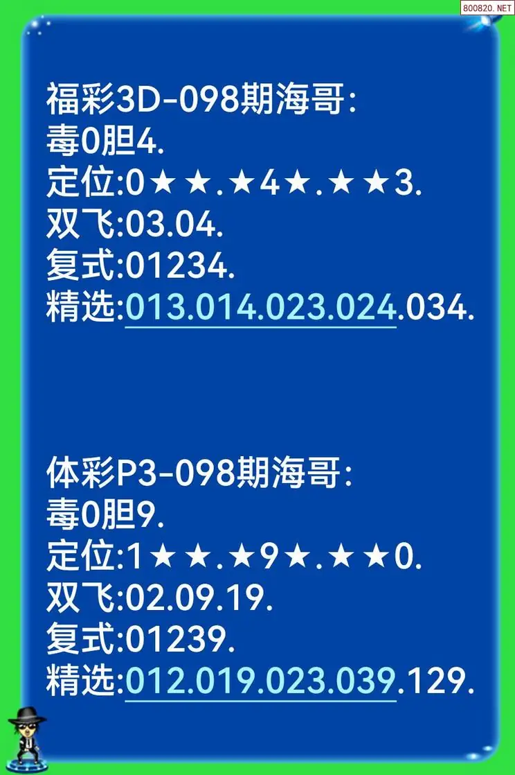 首页〉 3D胆码 走势图 3D胆码3D预测3D图谜3D字谜解太湖3D技巧3D条件3D杀码天齐图库走势图工具试机号 [海哥]第098期3d本期双胆 专题:海哥三胆 发布时间:2026-04-17 21:34 开奖:3D开奖结果3D近10期试机号 推荐:宝彩APP 免费方案 智能荐号 热点导航 公告: 天齐新版APP<中大多>上线,点击领鲜 最新文章 中大多 3D第2026098徐文选3D独胆已连准 3D第2026098卜算子奇偶分析 3D福彩26年098期[朝夕]胆码3D福彩26年098期[坏小子]推荐双胆胆码3D福彩26年098期[勇敢者]推荐双胆胆码3D福彩26年098期[骨肉计]推荐双胆胆码3D福彩26年098期[地球]预测今日双胆胆码3D福彩26年098期[墨鱼]胆码预测 更多3D胆码 > 福彩3D 双色球 大乐透 排列三 更多> 3D胆码 3D预测 3D字谜 3D图谜 解太湖 3D条件 3D杀码 P3预测 P3图谜 P3字谜 P3条件 P3胆码 P3杀码 热点导航 天齐图库 走势图 工具图表 试机号 宝彩专家 智能荐号 菜单导航 关闭 福彩3D 3D专家 3D胆码 3D预测 3D字谜 3D图谜 解太湖 3D条件 3D杀码 3D技巧 3D走势图 体彩P3/P5 P3专家 P3预测 P3图谜 P3字谜 P3条件 P3胆码 P3杀码 P5预测 P3走势图 双色球 双色球专家 双色球预测 双色球杀号 双色球字图 双色球胆码 双色球走势 双色球技巧 大乐透 大乐透专家 大乐透预测 大乐透杀号 大乐透胆码 大乐透技巧 大乐透走势 天齐图库 七星彩 七星彩专家 七星彩预测 七星彩图谜 七星彩杀号 七星彩技巧 七星彩走势 天齐走势 七乐彩 七乐彩专家 七乐彩预测 七乐彩杀号 七乐彩技巧 七乐彩走势 热点导航 彩宝网 宝彩网 宝彩网 开奖公告 宝彩专家 牛票票