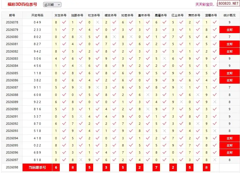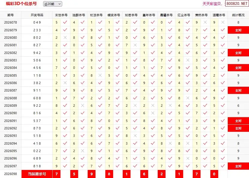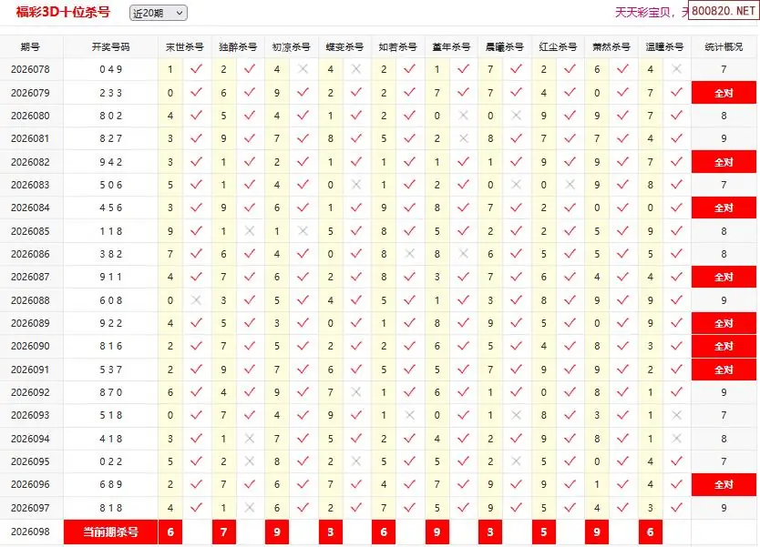 首页〉 3D杀码 走势图 3D胆码3D预测3D图谜3D字谜解太湖3D技巧3D条件3D杀码天齐图库走势图工具试机号 26098期彩宝贝福彩3D百十个位杀号 专题:3D杀码十专家 发布时间:2026-04-18 10:38 开奖:3D开奖结果3D近10期试机号 推荐:宝彩APP 免费方案 智能荐号 热点导航 公告: 天齐新版APP<中大多>上线,点击领鲜 最新文章 中大多 3D第2026098免费领取三注直选 3D第2026098真帝王宝图预测3D准 26年098期[浮梦一生]3d杀一胆 97错2726年098期[醉相思]3d杀一码 97错2226年098期[忆往昔]3d本期杀号 97错3226年098期[顾棋]本期3d杀号 97错2826年098期[孤影梵然]杀双胆 97错4626年098期[流星风雨]3d杀一码 97错40 更多3D杀码 > 福彩3D 双色球 大乐透 排列三 更多> 3D胆码 3D预测 3D字谜 3D图谜 解太湖 3D条件 3D杀码 P3预测 P3图谜 P3字谜 P3条件 P3胆码 P3杀码 热点导航 天齐图库 走势图 工具图表 试机号 宝彩专家 智能荐号 菜单导航 关闭 福彩3D 3D专家 3D胆码 3D预测 3D字谜 3D图谜 解太湖 3D条件 3D杀码 3D技巧 3D走势图 体彩P3/P5 P3专家 P3预测 P3图谜 P3字谜 P3条件 P3胆码 P3杀码 P5预测 P3走势图 双色球 双色球专家 双色球预测 双色球杀号 双色球字图 双色球胆码 双色球走势 双色球技巧 大乐透 大乐透专家 大乐透预测 大乐透杀号 大乐透胆码 大乐透技巧 大乐透走势 天齐图库 七星彩 七星彩专家 七星彩预测 七星彩图谜 七星彩杀号 七星彩技巧 七星彩走势 天齐走势 七乐彩 七乐彩专家 七乐彩预测 七乐彩杀号 七乐彩技巧 七乐彩走势 热点导航 彩宝网 宝彩网 宝彩网 开奖公告 宝彩专家 牛票票