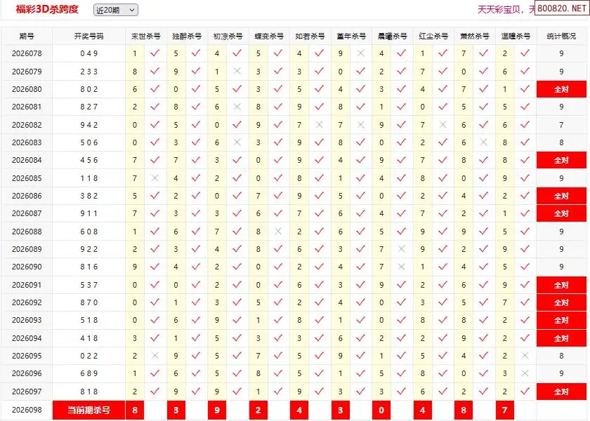 首页〉 3D条件 走势图 3D胆码3D预测3D图谜3D字谜解太湖3D技巧3D条件3D杀码天齐图库走势图工具试机号 26098期彩宝贝福彩3D杀跨度 专题:3d跨度专家杀跨汇总 发布时间:2026-04-18 10:38 开奖:3D开奖结果3D近10期试机号 推荐:宝彩APP 免费方案 智能荐号 热点导航 公告: 天齐新版APP<中大多>上线,点击领鲜 最新文章 中大多 3D第2026098独胆*双飞*三码 3D第2026098《直选一注连中3期》 [交友]第2026098期3D本期单挑和差2026年福彩3D098期[天涯草]精选断组-原创2026年福彩3D098期[圆圆]杀二码组合-原创2026年福彩3D098期[神算胆王]绝杀和值-原创2026年福彩3D098期[仙子]杀跨度-原创2026年福彩3D098期[无殇]专业断组-原创 更多3D条件 > 福彩3D 双色球 大乐透 排列三 更多> 3D胆码 3D预测 3D字谜 3D图谜 解太湖 3D条件 3D杀码 P3预测 P3图谜 P3字谜 P3条件 P3胆码 P3杀码 热点导航 天齐图库 走势图 工具图表 试机号 宝彩专家 智能荐号 菜单导航 关闭 福彩3D 3D专家 3D胆码 3D预测 3D字谜 3D图谜 解太湖 3D条件 3D杀码 3D技巧 3D走势图 体彩P3/P5 P3专家 P3预测 P3图谜 P3字谜 P3条件 P3胆码 P3杀码 P5预测 P3走势图 双色球 双色球专家 双色球预测 双色球杀号 双色球字图 双色球胆码 双色球走势 双色球技巧 大乐透 大乐透专家 大乐透预测 大乐透杀号 大乐透胆码 大乐透技巧 大乐透走势 天齐图库 七星彩 七星彩专家 七星彩预测 七星彩图谜 七星彩杀号 七星彩技巧 七星彩走势 天齐走势 七乐彩 七乐彩专家 七乐彩预测 七乐彩杀号 七乐彩技巧 七乐彩走势 热点导航 彩宝网 宝彩网 宝彩网 开奖公告 宝彩专家 牛票票