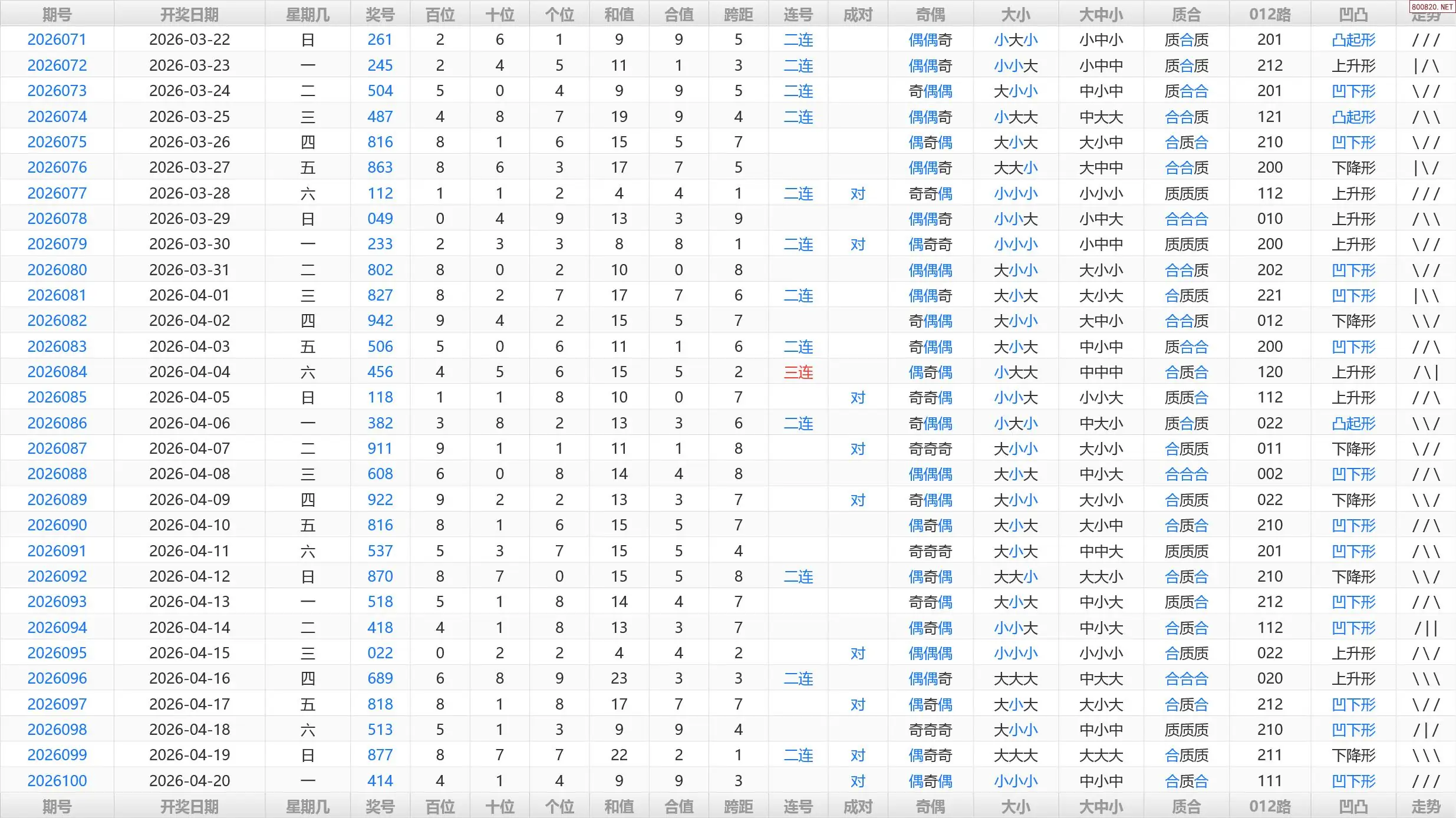 首页〉 3D预测 走势图 3D胆码3D预测3D图谜3D字谜解太湖3D技巧3D条件3D杀码天齐图库走势图工具试机号 101期福彩3D历史开奖号码统计表 发布时间:2026-04-20 21:59 开奖:3D开奖结果3D近10期试机号 推荐:宝彩APP 免费方案 智能荐号 热点导航 公告: 天齐新版APP<中大多>上线,点击领鲜 最新文章 中大多 3D第2026101免费领取三注直选 3D第2026101于海滨3D直选免费领 组选奖号414出现的前后关系26101期3D于海滨点评+专家一语定胆《保真》26年101期彩友吧各路3d专家预测分析汇总(天齐整理发布)26年101期3d启机开机号+夏兰{边城金码}26年101期每日天天彩于海滨3d号码精选胆26年101期福彩3d校验码632 更多3D预测 > 福彩3D 双色球 大乐透 排列三 更多> 3D胆码 3D预测 3D字谜 3D图谜 解太湖 3D条件 3D杀码 P3预测 P3图谜 P3字谜 P3条件 P3胆码 P3杀码 热点导航 天齐图库 走势图 工具图表 试机号 宝彩专家 智能荐号 菜单导航 关闭 福彩3D 3D专家 3D胆码 3D预测 3D字谜 3D图谜 解太湖 3D条件 3D杀码 3D技巧 3D走势图 体彩P3/P5 P3专家 P3预测 P3图谜 P3字谜 P3条件 P3胆码 P3杀码 P5预测 P3走势图 双色球 双色球专家 双色球预测 双色球杀号 双色球字图 双色球胆码 双色球走势 双色球技巧 大乐透 大乐透专家 大乐透预测 大乐透杀号 大乐透胆码 大乐透技巧 大乐透走势 天齐图库 七星彩 七星彩专家 七星彩预测 七星彩图谜 七星彩杀号 七星彩技巧 七星彩走势 天齐走势 七乐彩 七乐彩专家 七乐彩预测 七乐彩杀号 七乐彩技巧 七乐彩走势 热点导航 彩宝网 宝彩网 宝彩网 开奖公告 宝彩专家 牛票票
