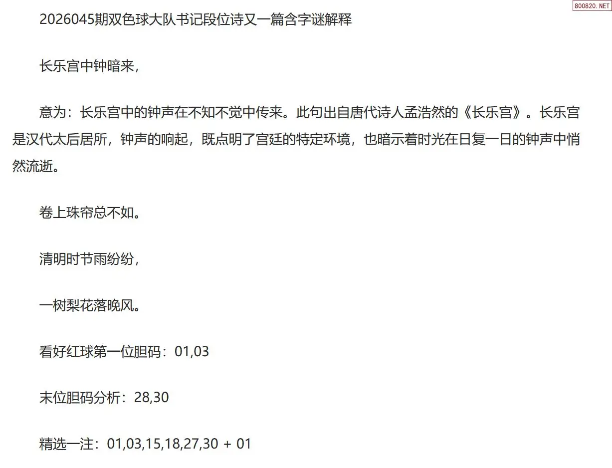 首页〉 双色球字图 走势图 双色球预测双色球杀号双色球技巧双色球字图双色球条件双色球胆码天齐图库走势图工具试机号 双色球第26045期大队书记最新段位诗谜又一篇 专题:大队书记 发布时间:2026-04-21 21:08 工具:双色球胆拖组号双色球缩水过滤 推荐:宝彩APP 免费方案 智能荐号 热点导航 公告: 天齐新版APP<中大多>上线,点击领鲜 最新文章 中大多 双色球第2026045精选一注直选推荐 双色球第2026045于海滨3D直选 藏机图2026045期天齐原创双色球藏机图迷2026045期天齐网今晚双色球字谜总汇双色球26045期图迷画迷汇总(天齐整理)双色球26年045期天吉龙头凤尾鸟语断蓝图26年045期大胜寨双色球中奖真言双色球26045期牛彩字谜诗迷汇总(天齐整理) 更多双色球字图 > 福彩3D 双色球 大乐透 排列三 更多> 3D胆码 3D预测 3D字谜 3D图谜 解太湖 3D条件 3D杀码 P3预测 P3图谜 P3字谜 P3条件 P3胆码 P3杀码 热点导航 天齐图库 走势图 工具图表 试机号 宝彩专家 智能荐号 菜单导航 关闭 福彩3D 3D专家 3D胆码 3D预测 3D字谜 3D图谜 解太湖 3D条件 3D杀码 3D技巧 3D走势图 体彩P3/P5 P3专家 P3预测 P3图谜 P3字谜 P3条件 P3胆码 P3杀码 P5预测 P3走势图 双色球 双色球专家 双色球预测 双色球杀号 双色球字图 双色球胆码 双色球走势 双色球技巧 大乐透 大乐透专家 大乐透预测 大乐透杀号 大乐透胆码 大乐透技巧 大乐透走势 天齐图库 七星彩 七星彩专家 七星彩预测 七星彩图谜 七星彩杀号 七星彩技巧 七星彩走势 天齐走势 七乐彩 七乐彩专家 七乐彩预测 七乐彩杀号 七乐彩技巧 七乐彩走势 热点导航 彩宝网 宝彩网 宝彩网 开奖公告 宝彩专家 牛票票