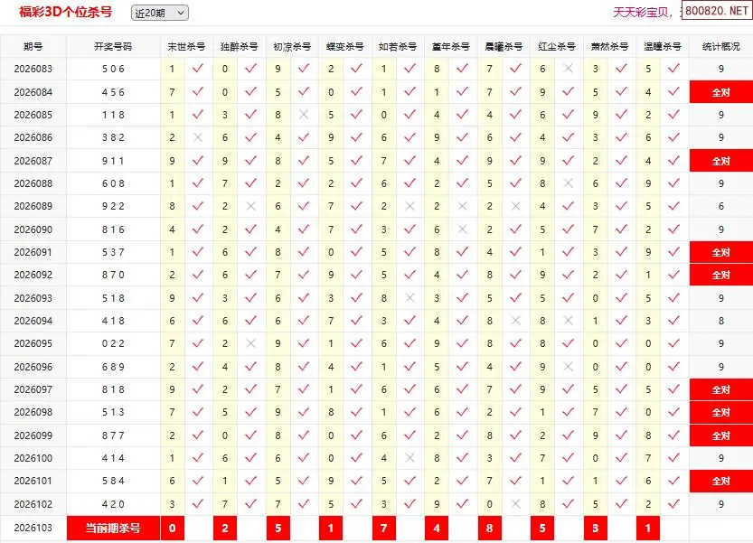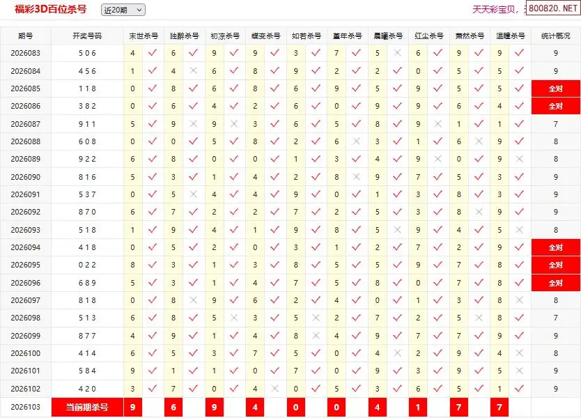 首页〉 3D杀码 走势图 3D胆码3D预测3D图谜3D字谜解太湖3D技巧3D条件3D杀码天齐图库走势图工具试机号 26103期彩宝贝福彩3D百十个位杀号 专题:3D杀码十专家 发布时间:2026-04-23 11:27 开奖:3D开奖结果3D近10期试机号 推荐:宝彩APP 免费方案 智能荐号 热点导航 公告: 天齐新版APP<中大多>上线,点击领鲜 最新文章 中大多 3D第2026103于海滨3D五码复试 3D第2026103真帝王宝图预测3D准 26103期彩宝贝福彩3D组选杀号26103期彩宝贝福彩3D百十个位杀号26年103期福彩3d彩经十大专家组选杀号26年103期福彩3d彩经十大专家直选杀号福彩3d26年103期澳客专家杀组选号码福彩3d26年103期澳客专家杀直选号码 更多3D杀码 > 福彩3D 双色球 大乐透 排列三 更多> 3D胆码 3D预测 3D字谜 3D图谜 解太湖 3D条件 3D杀码 P3预测 P3图谜 P3字谜 P3条件 P3胆码 P3杀码 热点导航 天齐图库 走势图 工具图表 试机号 宝彩专家 智能荐号 菜单导航 关闭 福彩3D 3D专家 3D胆码 3D预测 3D字谜 3D图谜 解太湖 3D条件 3D杀码 3D技巧 3D走势图 体彩P3/P5 P3专家 P3预测 P3图谜 P3字谜 P3条件 P3胆码 P3杀码 P5预测 P3走势图 双色球 双色球专家 双色球预测 双色球杀号 双色球字图 双色球胆码 双色球走势 双色球技巧 大乐透 大乐透专家 大乐透预测 大乐透杀号 大乐透胆码 大乐透技巧 大乐透走势 天齐图库 七星彩 七星彩专家 七星彩预测 七星彩图谜 七星彩杀号 七星彩技巧 七星彩走势 天齐走势 七乐彩 七乐彩专家 七乐彩预测 七乐彩杀号 七乐彩技巧 七乐彩走势 热点导航 彩宝网 宝彩网 宝彩网 开奖公告 宝彩专家 牛票票