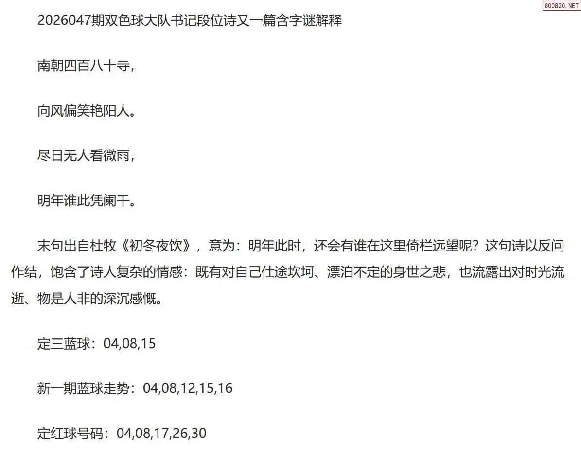 首页〉 双色球字图 走势图 双色球预测双色球杀号双色球技巧双色球字图双色球条件双色球胆码天齐图库走势图工具试机号 双色球第26047期大队书记最新段位诗谜又一篇 专题:大队书记 发布时间:2026-04-26 21:14 工具:双色球胆拖组号双色球缩水过滤 推荐:宝彩APP 免费方案 智能荐号 热点导航 公告: 天齐新版APP<中大多>上线,点击领鲜 最新文章 中大多 双色球第2026047唐龙3D独胆8中7 双色球第2026047组选形态(限10名) 藏机图2026047期天齐原创双色球藏机图迷2026047期天齐网今晚双色球字谜总汇双色球26047期图迷画迷汇总(天齐整理)双色球26年047期天吉龙头凤尾鸟语断蓝图双色球26年047期左岸春风一语断蓝球(另版)双色球第26047期大队书记最新段位诗谜又一篇 更多双色球字图 > 福彩3D 双色球 大乐透 排列三 更多> 3D胆码 3D预测 3D字谜 3D图谜 解太湖 3D条件 3D杀码 P3预测 P3图谜 P3字谜 P3条件 P3胆码 P3杀码 热点导航 天齐图库 走势图 工具图表 试机号 宝彩专家 智能荐号 菜单导航 关闭 福彩3D 3D专家 3D胆码 3D预测 3D字谜 3D图谜 解太湖 3D条件 3D杀码 3D技巧 3D走势图 体彩P3/P5 P3专家 P3预测 P3图谜 P3字谜 P3条件 P3胆码 P3杀码 P5预测 P3走势图 双色球 双色球专家 双色球预测 双色球杀号 双色球字图 双色球胆码 双色球走势 双色球技巧 大乐透 大乐透专家 大乐透预测 大乐透杀号 大乐透胆码 大乐透技巧 大乐透走势 天齐图库 七星彩 七星彩专家 七星彩预测 七星彩图谜 七星彩杀号 七星彩技巧 七星彩走势 天齐走势 七乐彩 七乐彩专家 七乐彩预测 七乐彩杀号 七乐彩技巧 七乐彩走势 热点导航 彩宝网 宝彩网 宝彩网 开奖公告 宝彩专家 牛票票